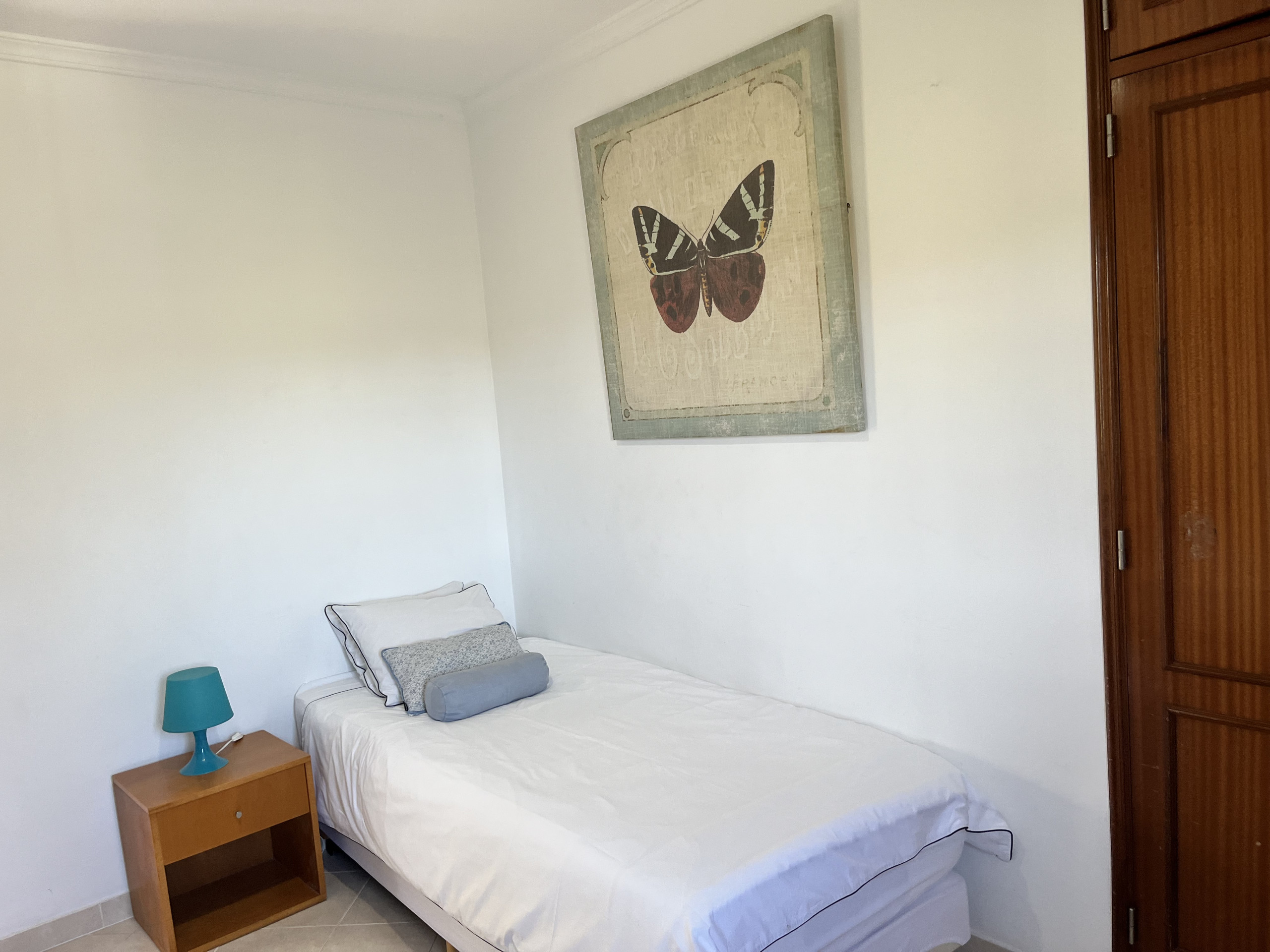 Schlafzimmer 2 ist mit zwei Einzelbetten, Einbauschränken und Terrassentüren ausgestattet.