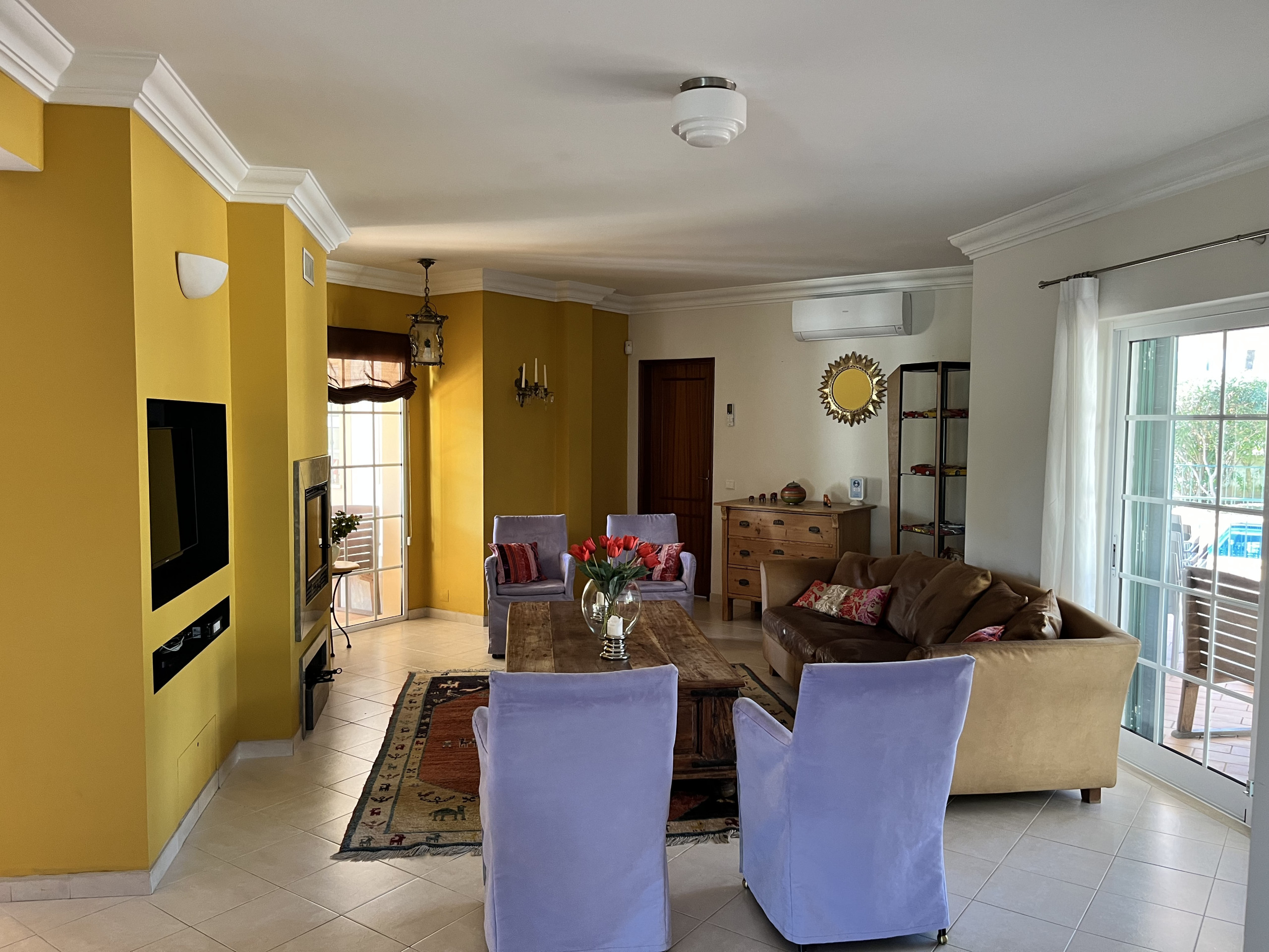 Im Erdgeschoss befindet sich ein großzügiger Wohnbereich mit Sofas und Sesseln, Klimaanlage, TV, Esstisch für 8 Personen sowie einem markanten Kamin. Terrassentüren führen direkt auf die Terrasse und in den Garten.
