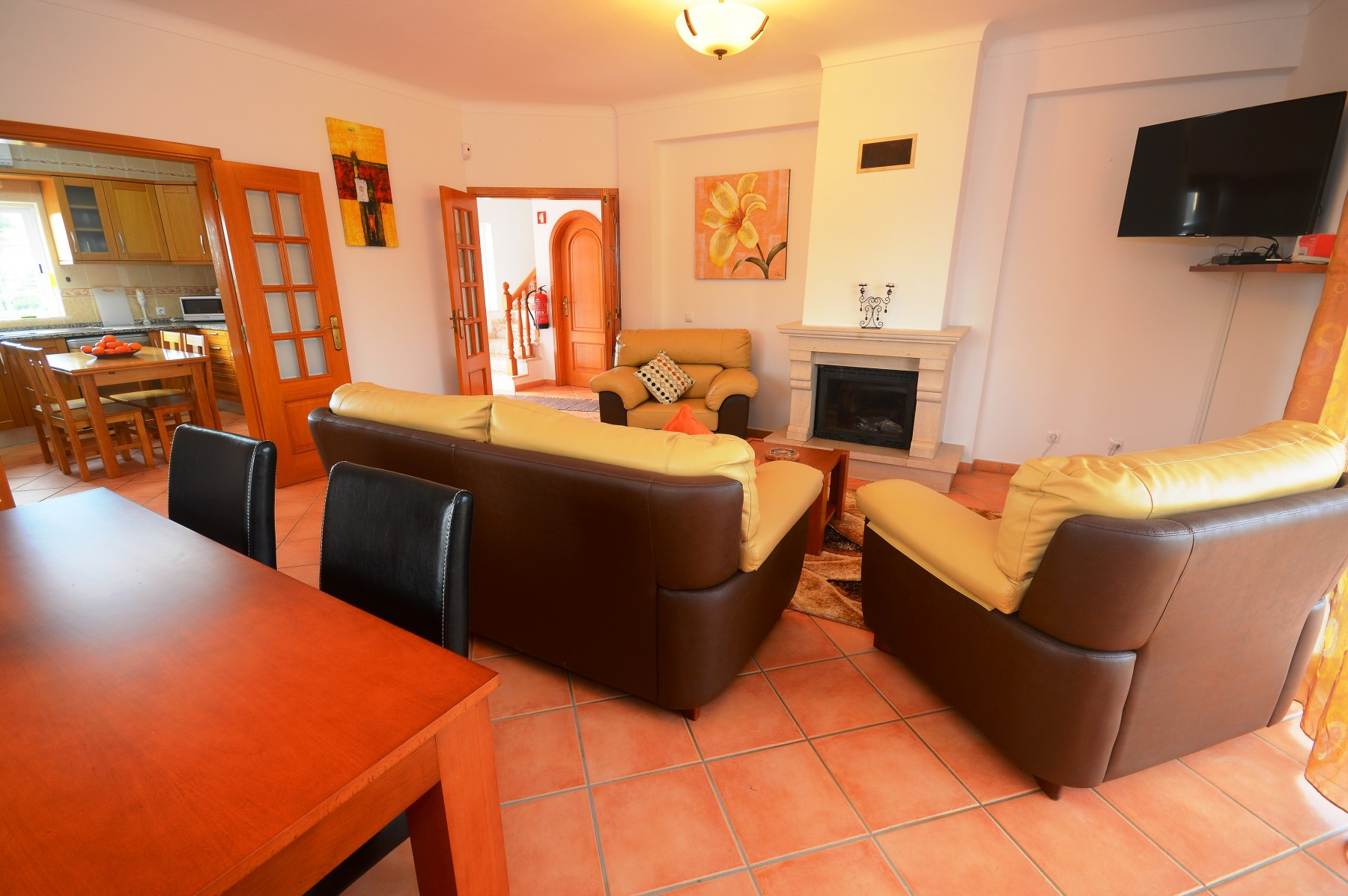 Der Wohn- und Essbereich verfügt ebenfalls über Terrassentüren mit Zugang zur Terrasse und Blick auf den Swimmingpool. Zur Ausstattung gehören bequeme Sofas (eines davon als Einzelschlafsofa nutzbar), Esstisch mit Stühlen, ein dekorativer Kamin, Flachbild-TV mit einigen internationalen Sendern, DVD-Player sowie Klimaanlage.