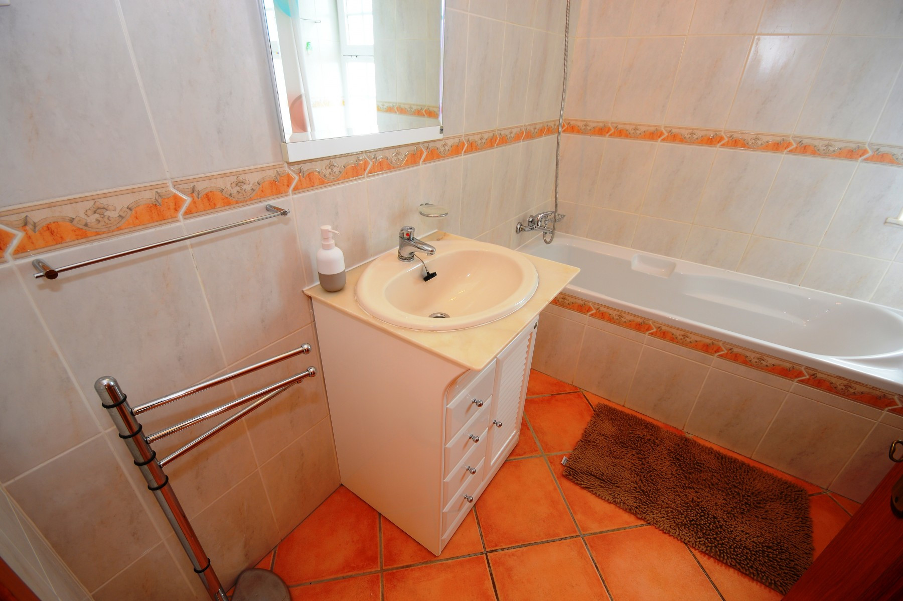 Das Badezimmer im Obergeschoss ist mit einer Badewanne mit Duschvorrichtung ausgestattet.