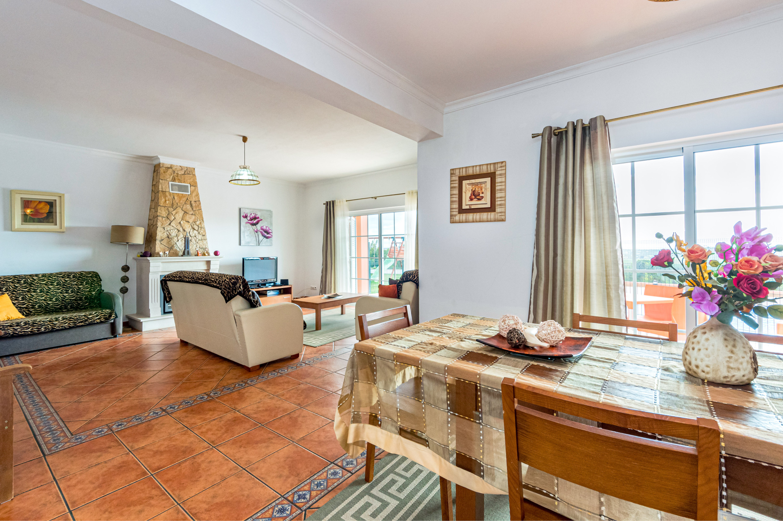 Der Wohn- und Essbereich verfügt ebenfalls über Terrassentüren mit Zugang zur Terrasse und Blick auf den Swimmingpool. Zur Ausstattung gehören bequeme Sofas (eines davon als Einzelschlafsofa nutzbar), Esstisch mit Stühlen, ein dekorativer Kamin, Flachbild-TV mit einigen internationalen Sendern, DVD-Player sowie Klimaanlage.