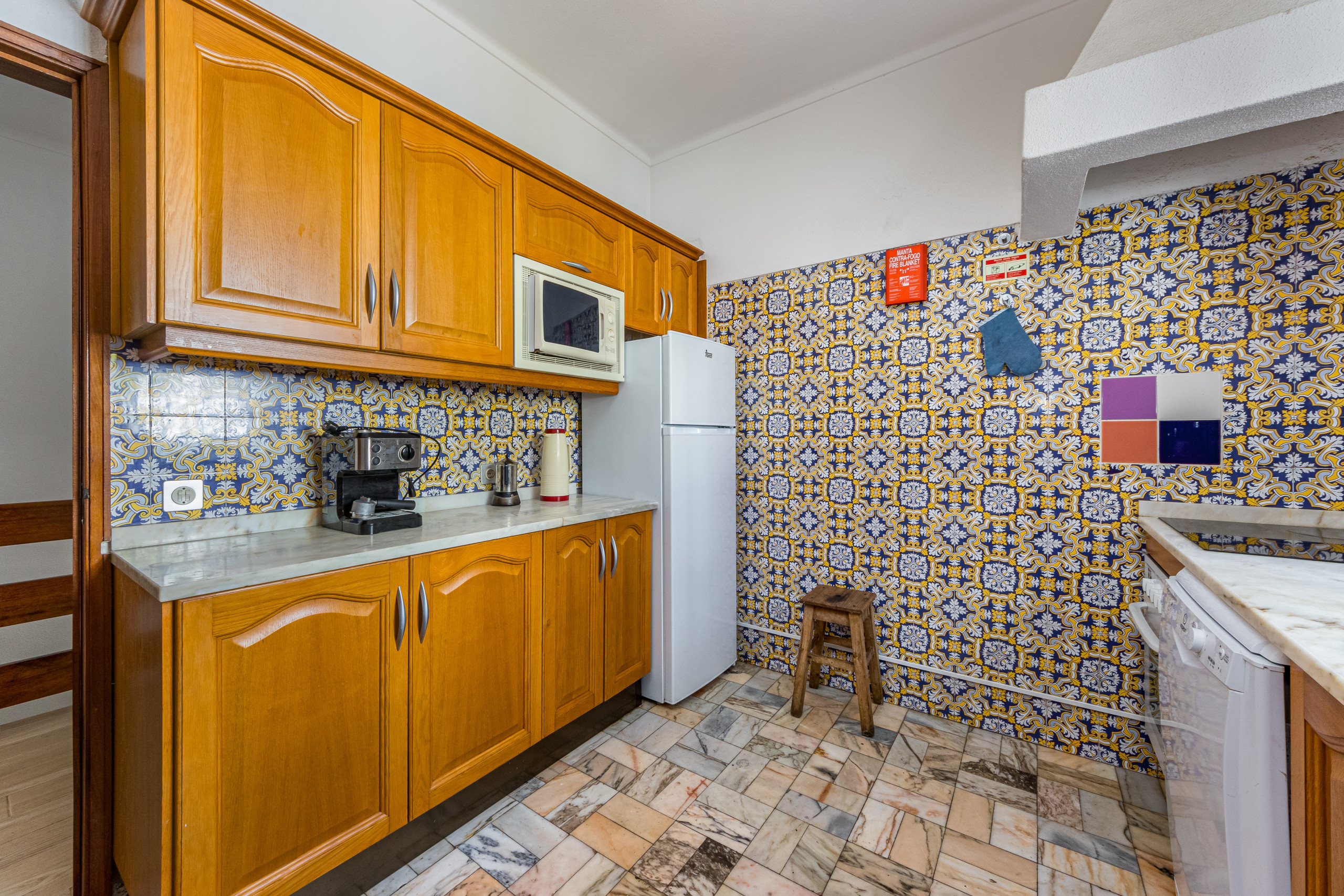 Die Küche ist mit Holz-Einbauschränken und Marmor-Arbeitsflächen ausgestattet und verfügt über: