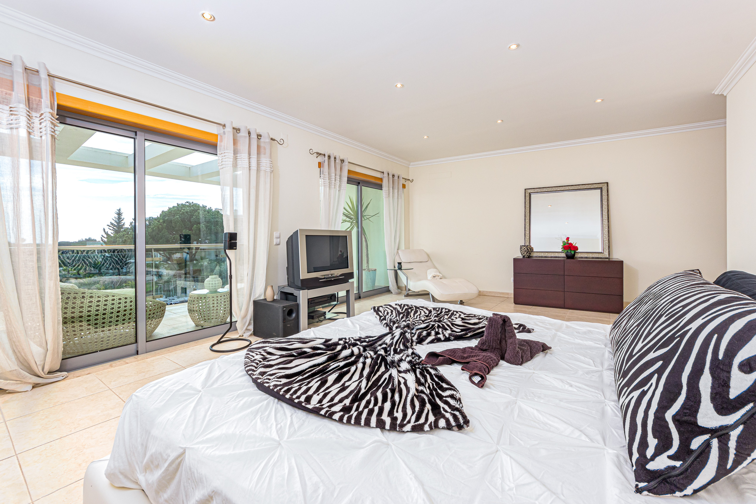 Il donne accès à une grande terrasse privée exposée plein sud avec vue sur la piscine, les jardins et la mer au loin.