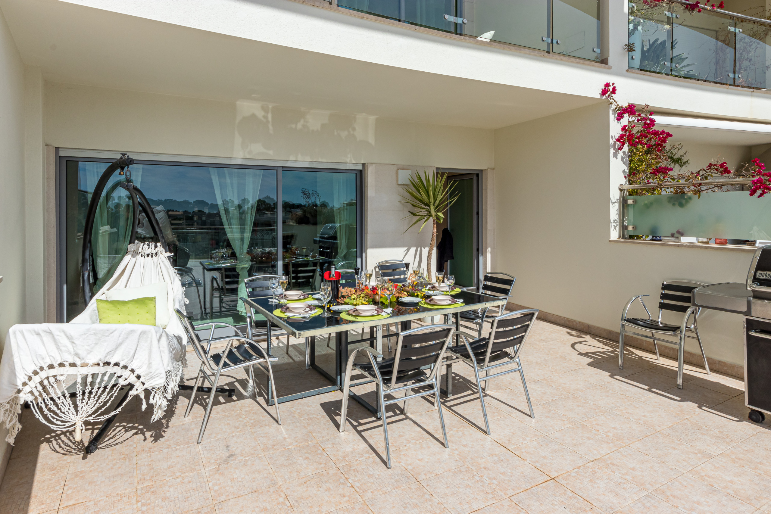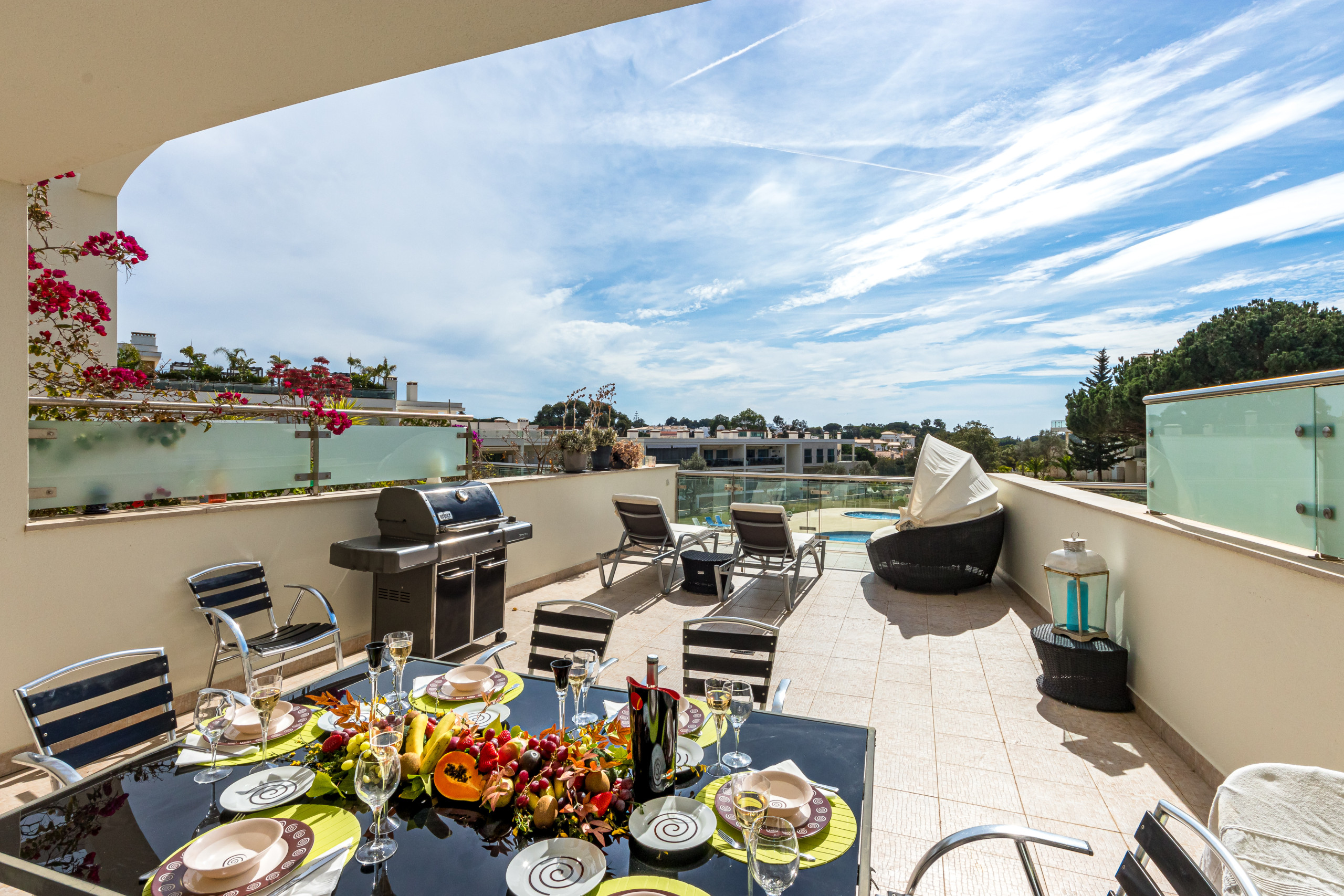 La terrasse est équipée d’un barbecue à gaz, d’une table et de chaises.