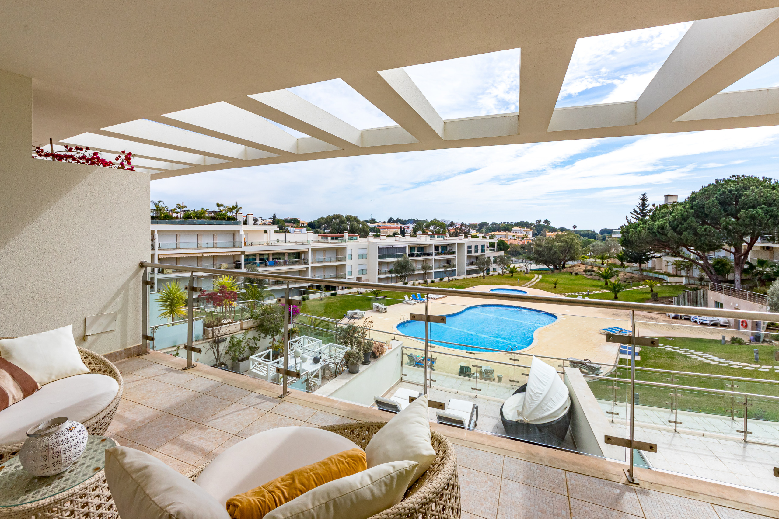 La copropriété dispose d’une grande piscine commune, d’une piscine pour enfants, d’un court de tennis et de vastes jardins paysagers.