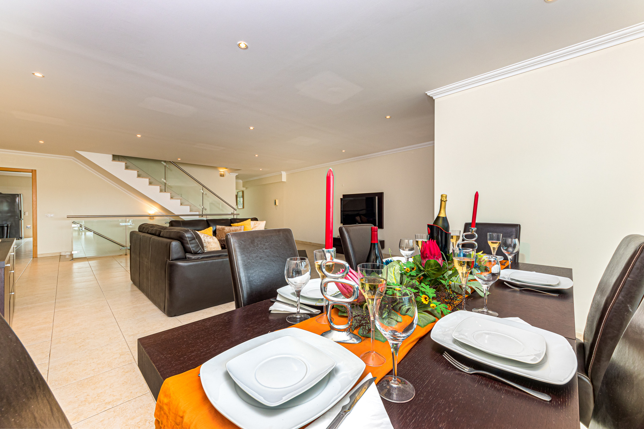 Le salon / salle à manger ouvert est élégamment meublé avec des canapés confortables, une table à manger pour 8 personnes et une TV écran plat avec système surround.
