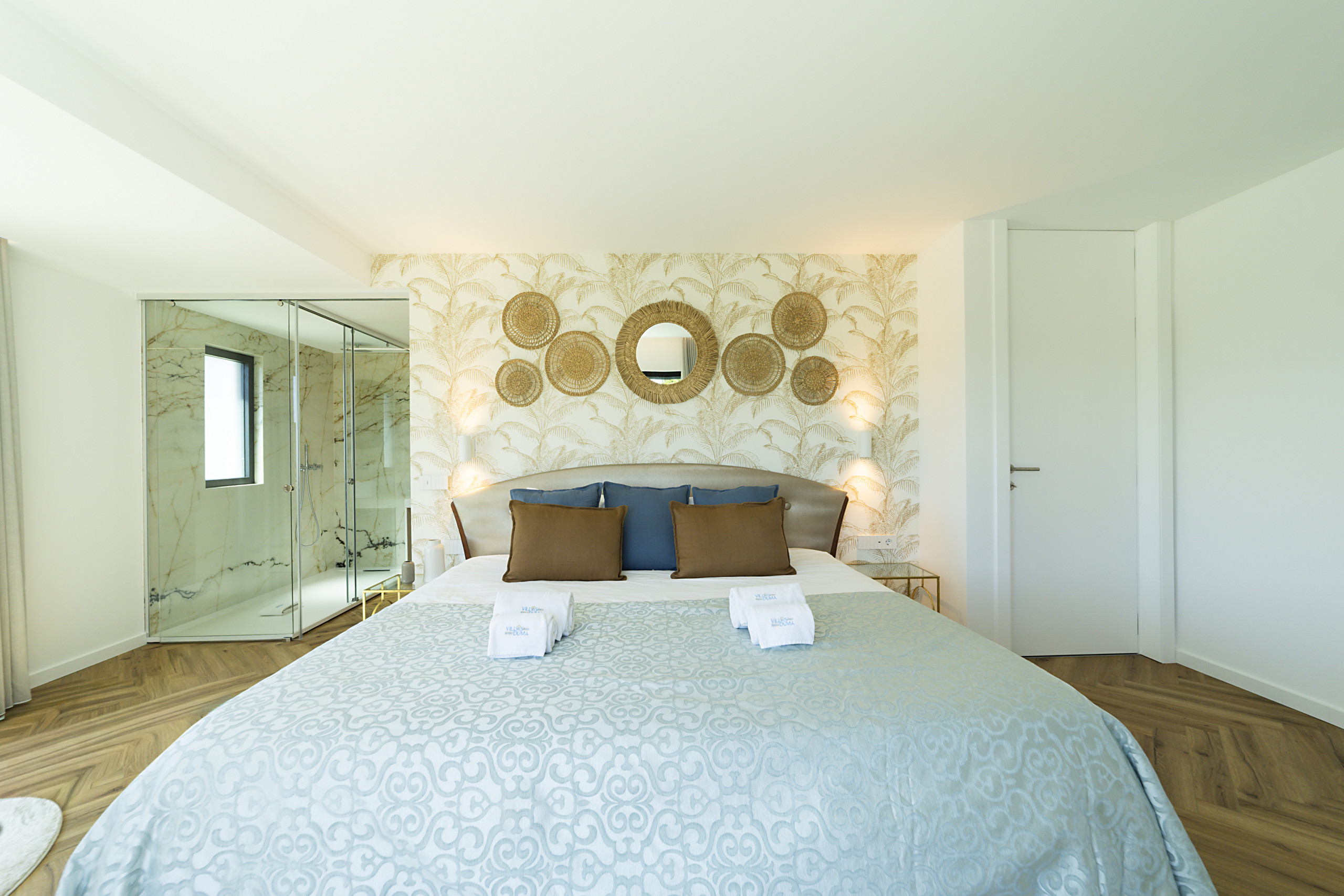 Suite parentale avec lit double, grands placards, petite fenêtre avec vue piscine et salle de bain privative (baignoire/douche, WC, bidet, lavabo)