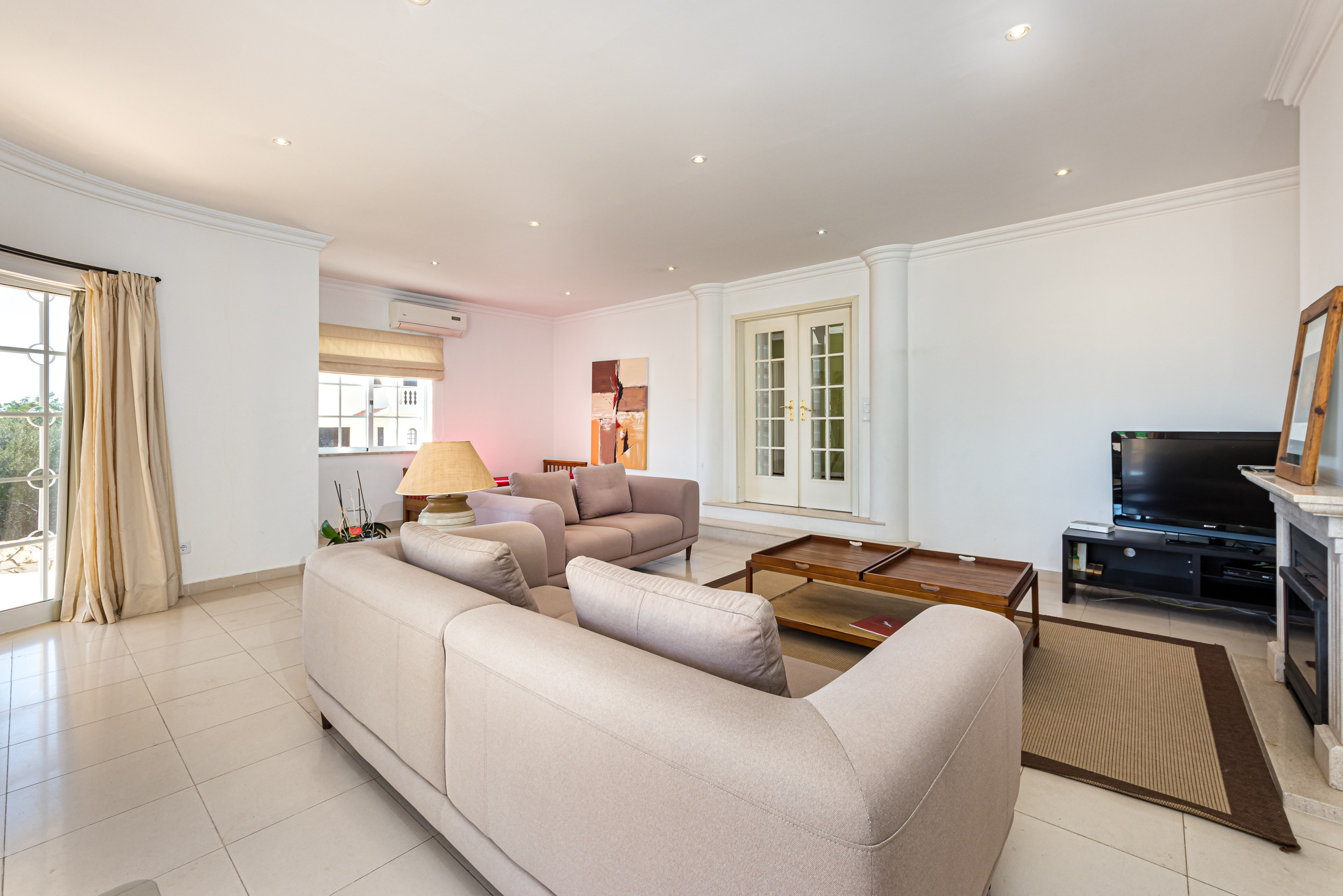 Le salon / salle à manger sur plusieurs niveaux est aménagé avec des canapés confortables, une cheminée, une télévision à écran plat, une table à manger avec chaises et la climatisation. Des portes-fenêtres donnent accès à la terrasse de la piscine et aux jardins.