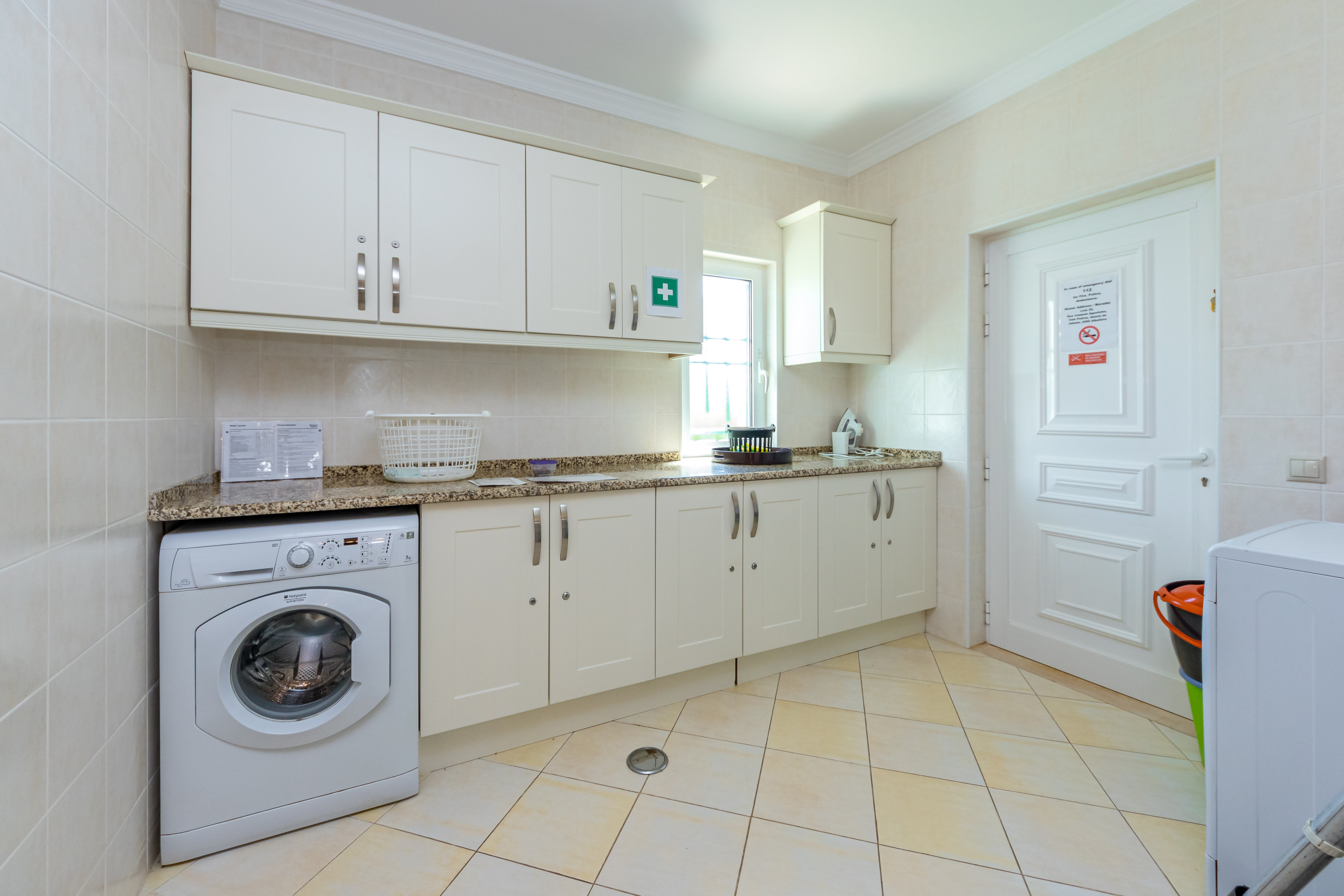 La buanderie séparée est équipée d’un lave-linge, d’un sèche-linge, d’un fer et d’une planche à repasser, ainsi que de nombreux espaces de rangement.