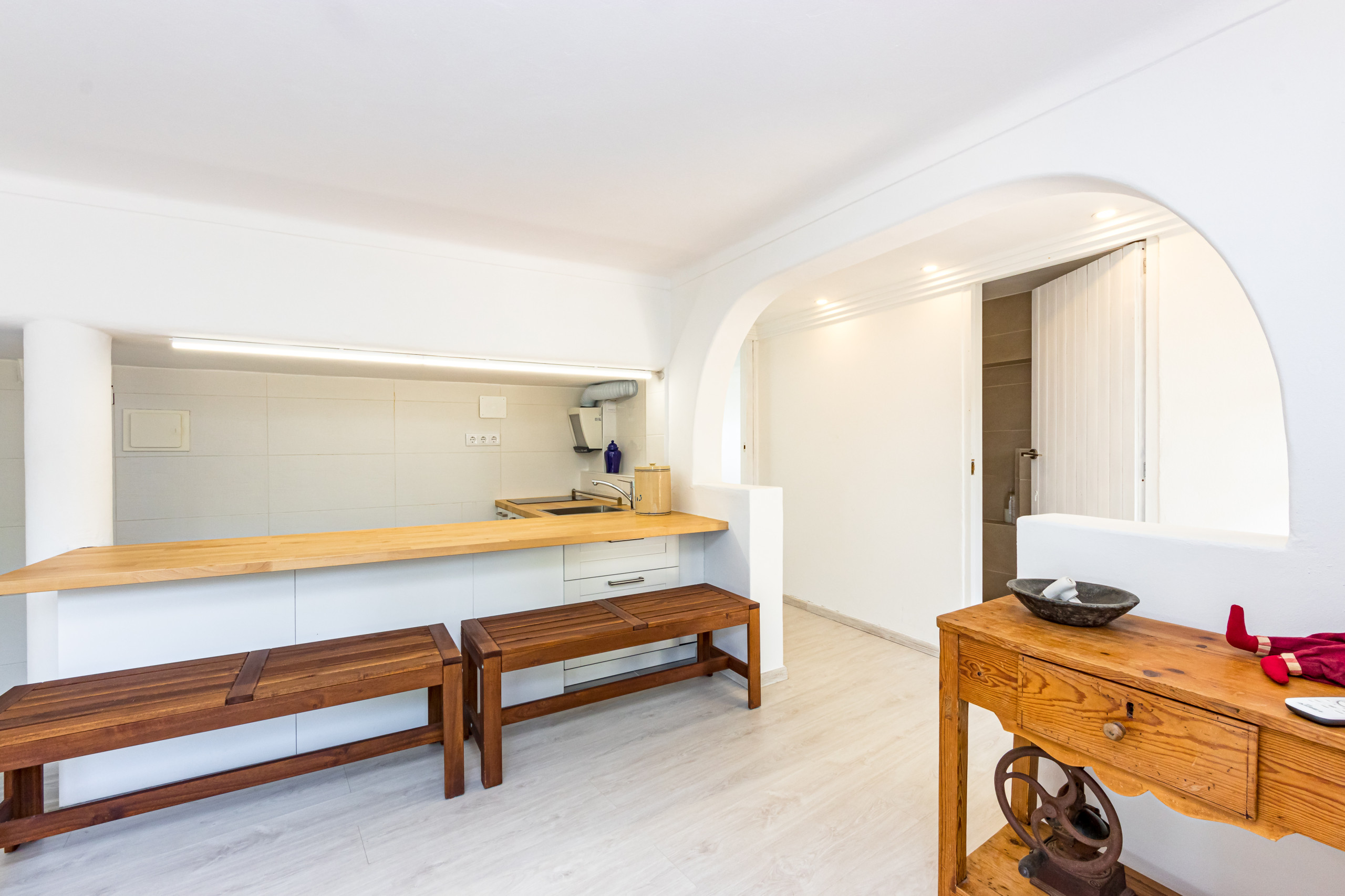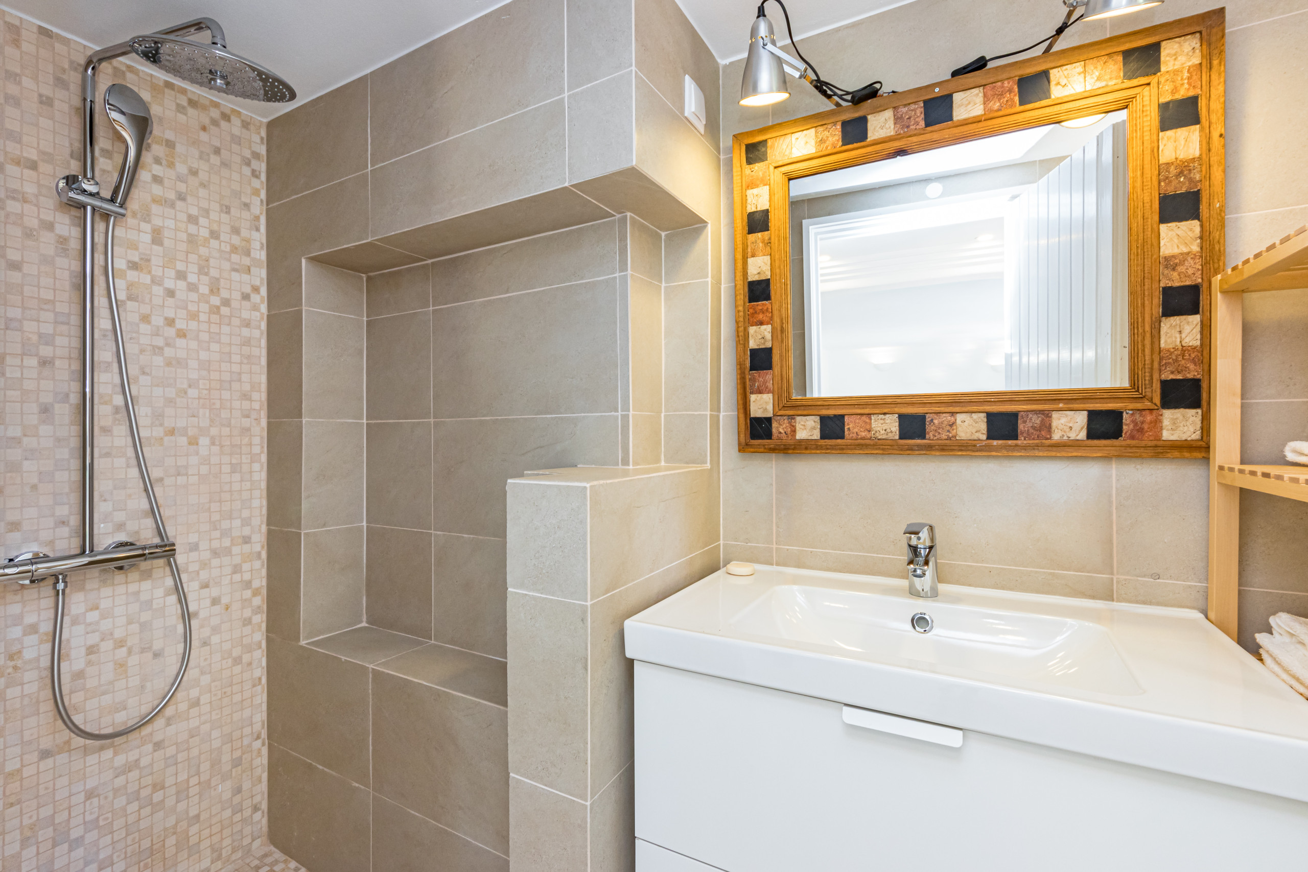 Du côté opposé se trouve une buanderie équipée d’un lave-linge/sèche-linge combiné ainsi que d’un fer et d’une planche à repasser. Une porte donne accès à la piscine et au jardin.