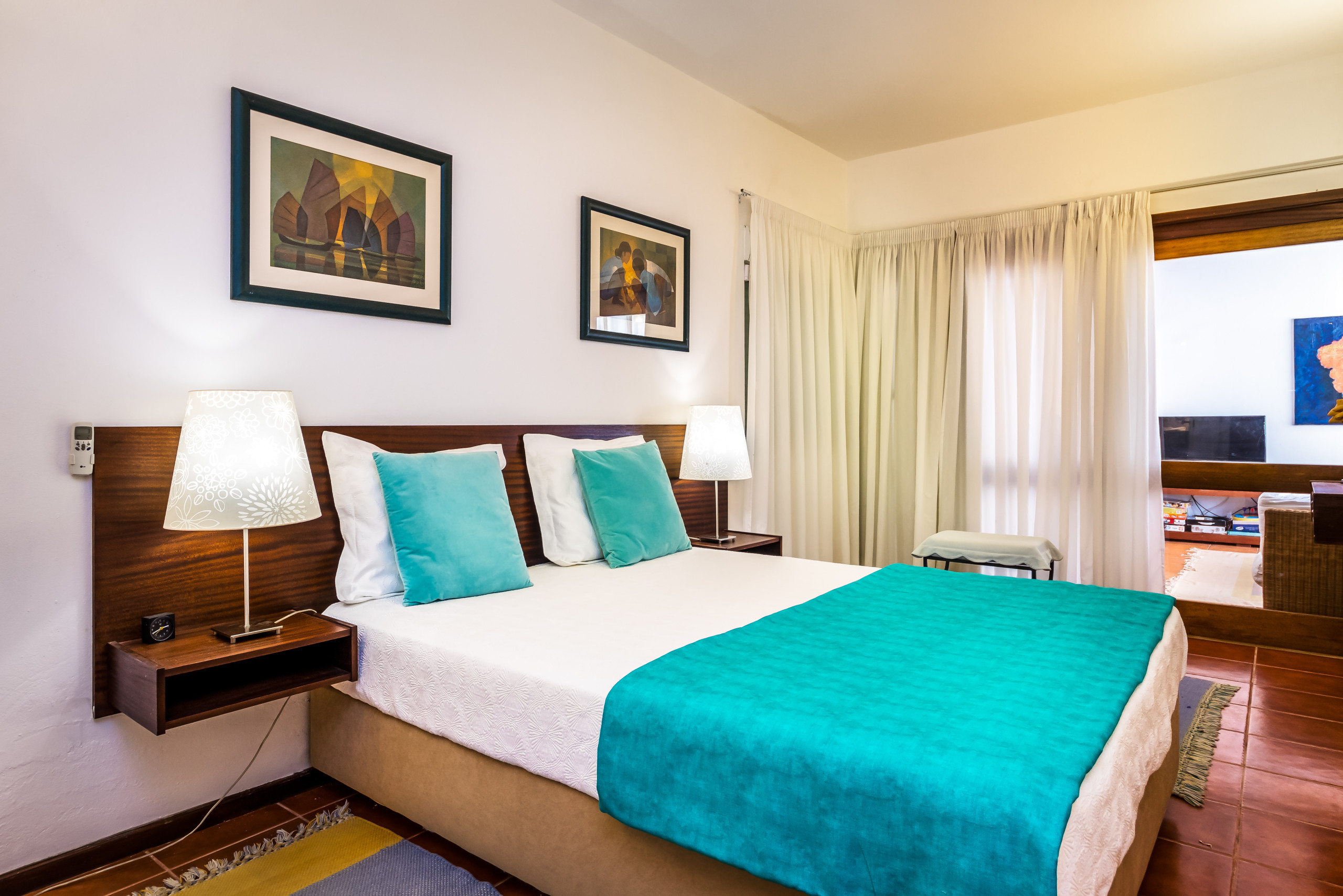 La chambre principale dispose d’un lit double et d’une salle de bains privative avec baignoire et douche.