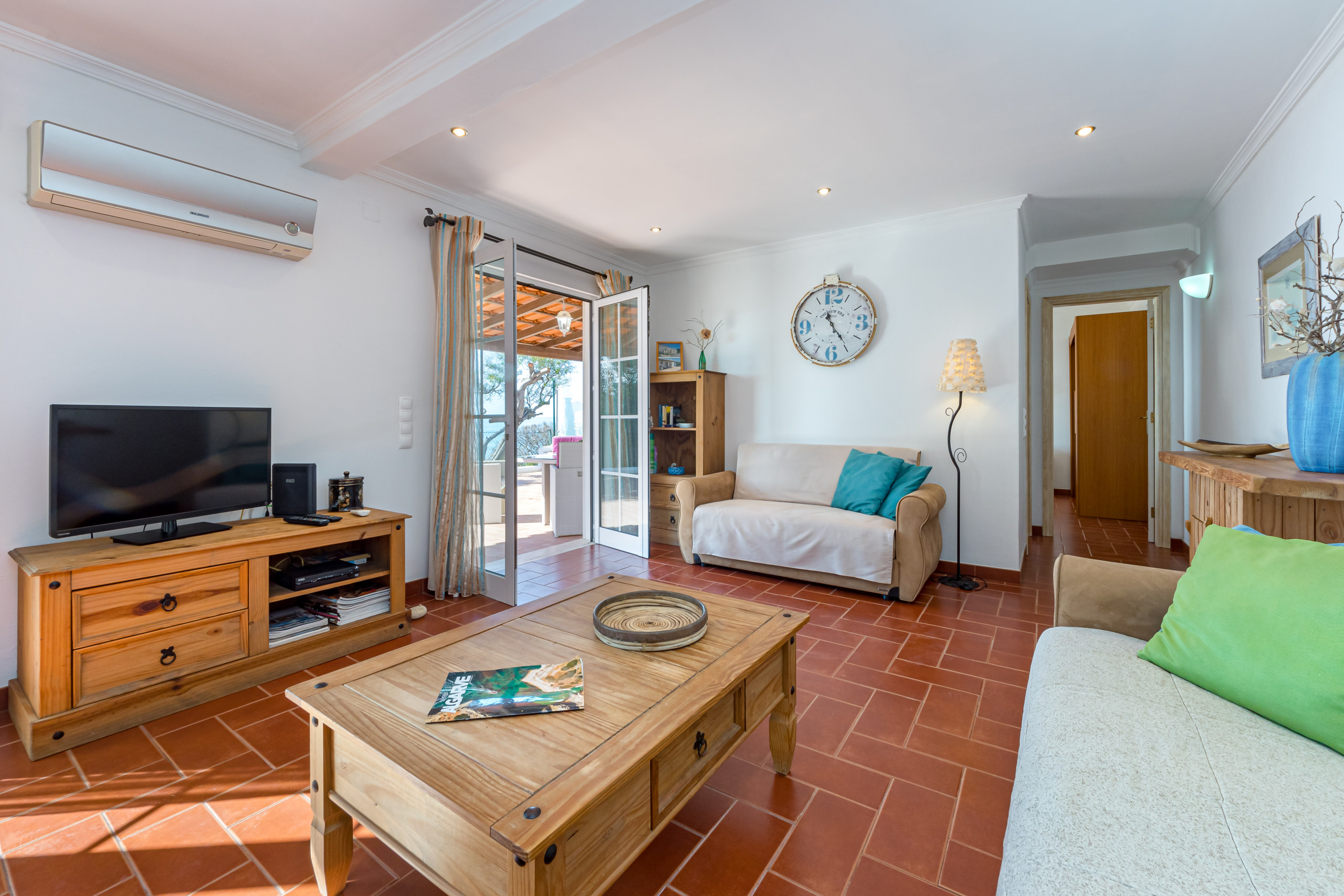 No interior, esta luminosa casa geminada tem uma área de estar com um sofá-cama duplo, outro sofá adicional, TV e mesa de jantar com 4 cadeiras e ar condicionado.