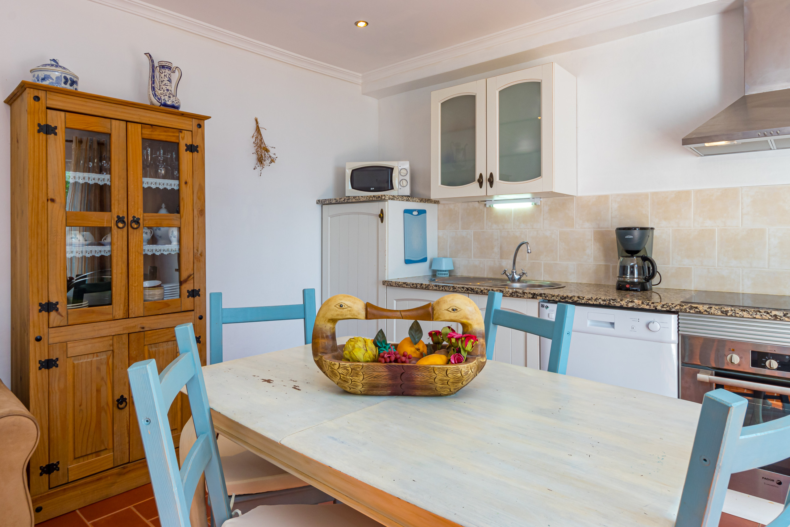 A kitchenette tem armários brancos com a bancada em granito e eletrodomésticos incluindo micro-ondas, placa elétrica, exaustor, forno elétrico, frigorífico com congelador, máquina de lavar louça, chaleira elétrica, máquina de café, espremedor elétrico, batedor de mão elétrico e todos os utensílios, panelas e louças necessários. A máquina de lavar roupa, o ferro de engomar e a tábua de engomar estão numa pequena área de lavandaria separada.