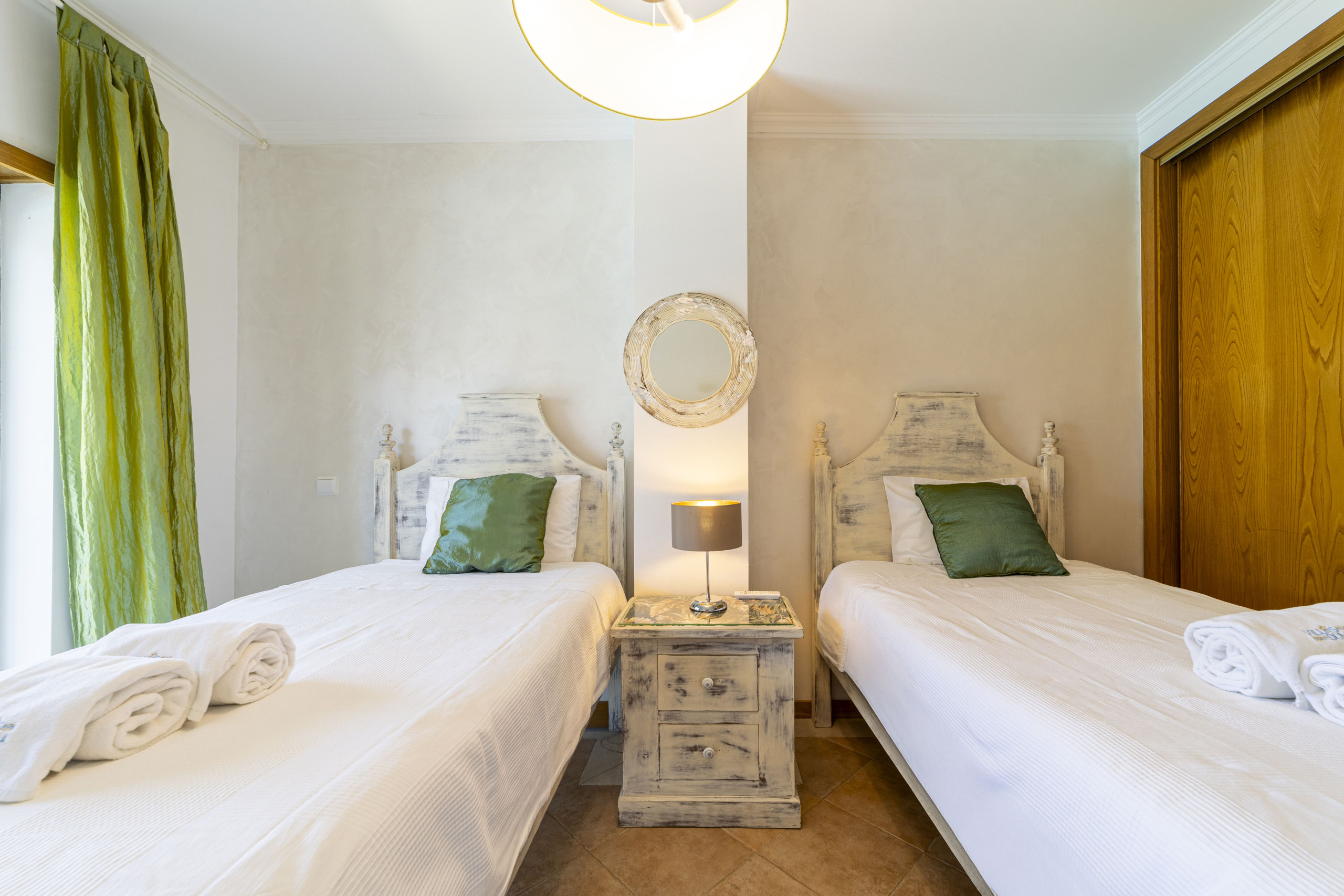 No primeiro andar, o quarto 1 tem duas camas individuais, ar condicionado, grandes roupeiros embutidos e portas duplas abrindo-se para uma varanda compartilhada com vista para os jardins e piscina comuns.