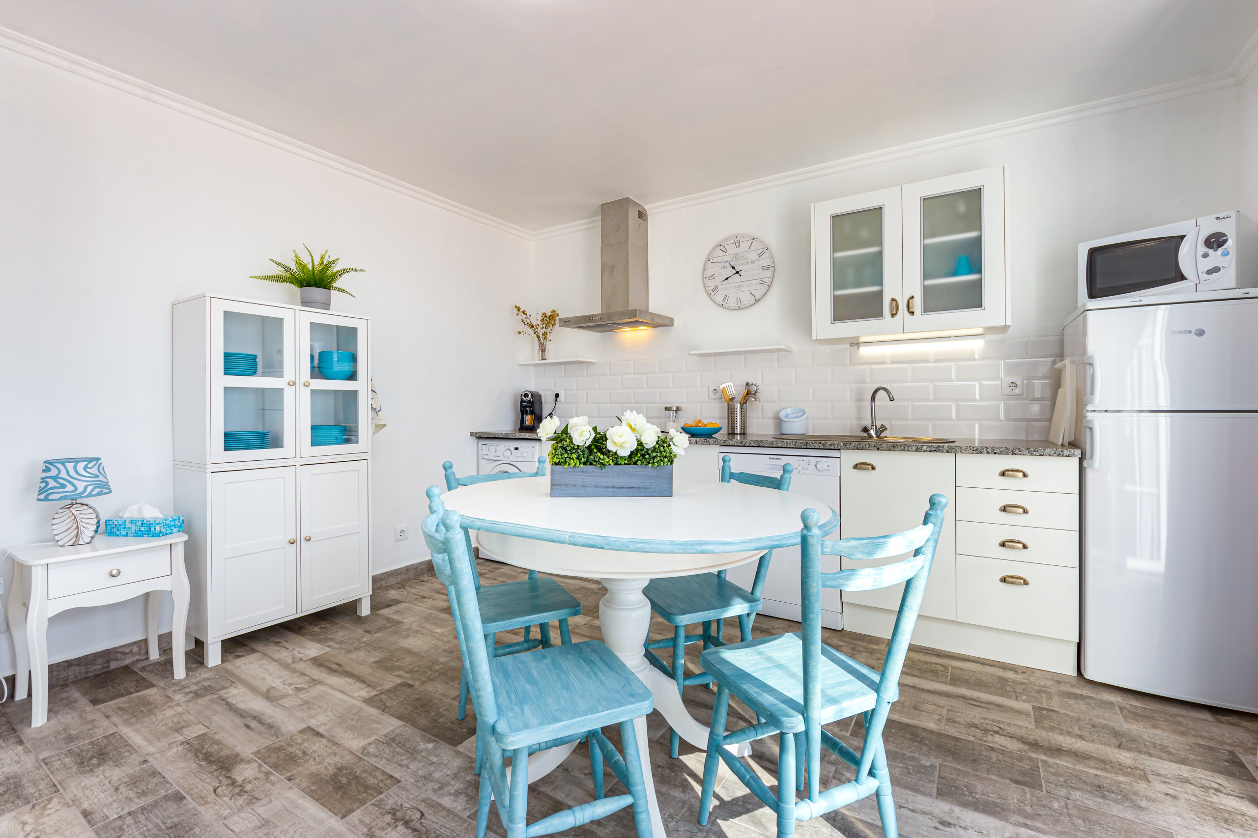 A cozinha branca tem um balcão de granito e é equipada com micro-ondas, fogão elétrico, ventilador extrator, frigorífico com congelador, máquina de lavar roupa, máquina de lavar loiça, chaleira elétrica, torradeira, máquina de café, espremedor de sumo elétrico, varinha mágica e todos os utensílios necessários, panelas e loiças.