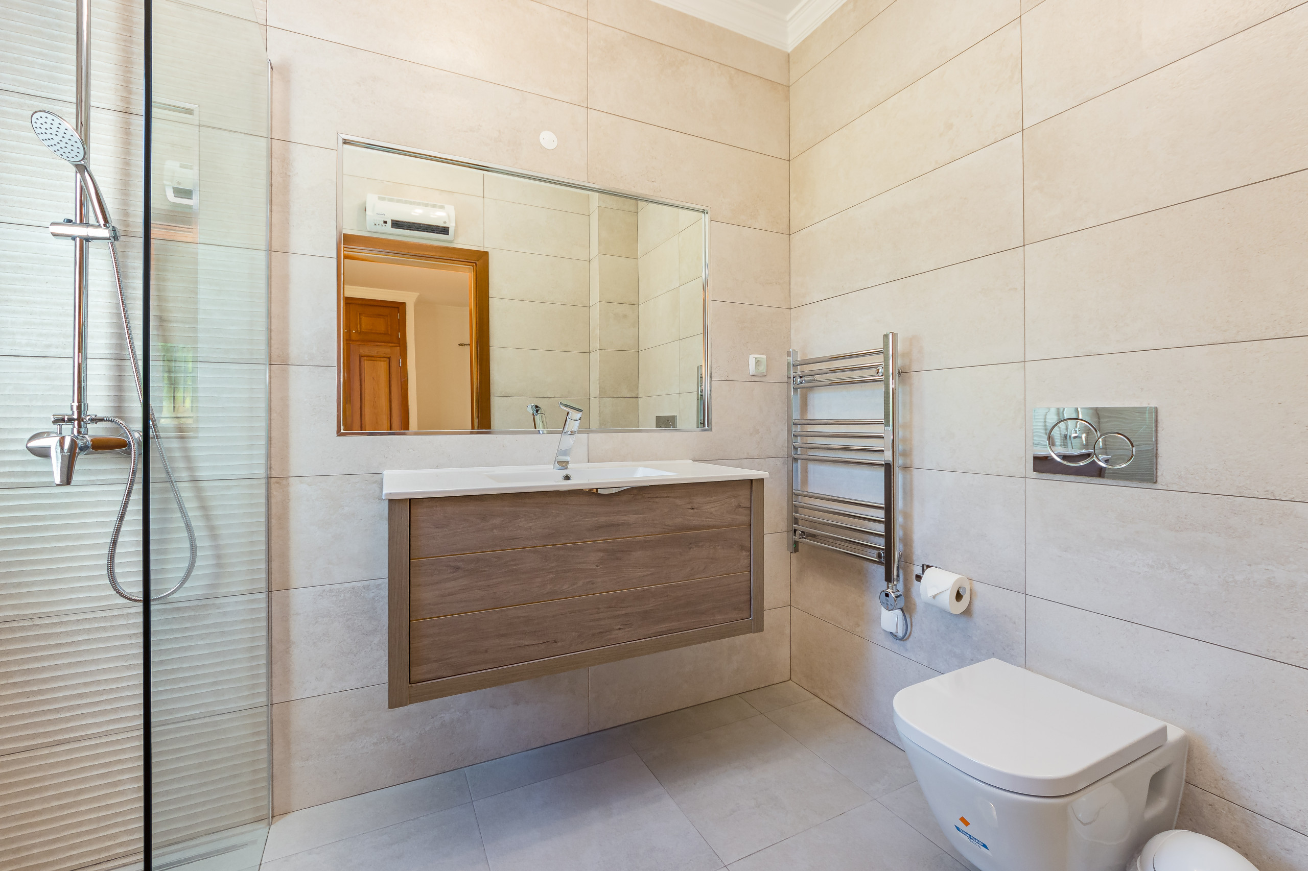Entrando na moradia há um quarto com duas camas individuais e roupeiros embutidos no rés do chão. Este quarto tem uma casa de banho privativa com um duche amplo.