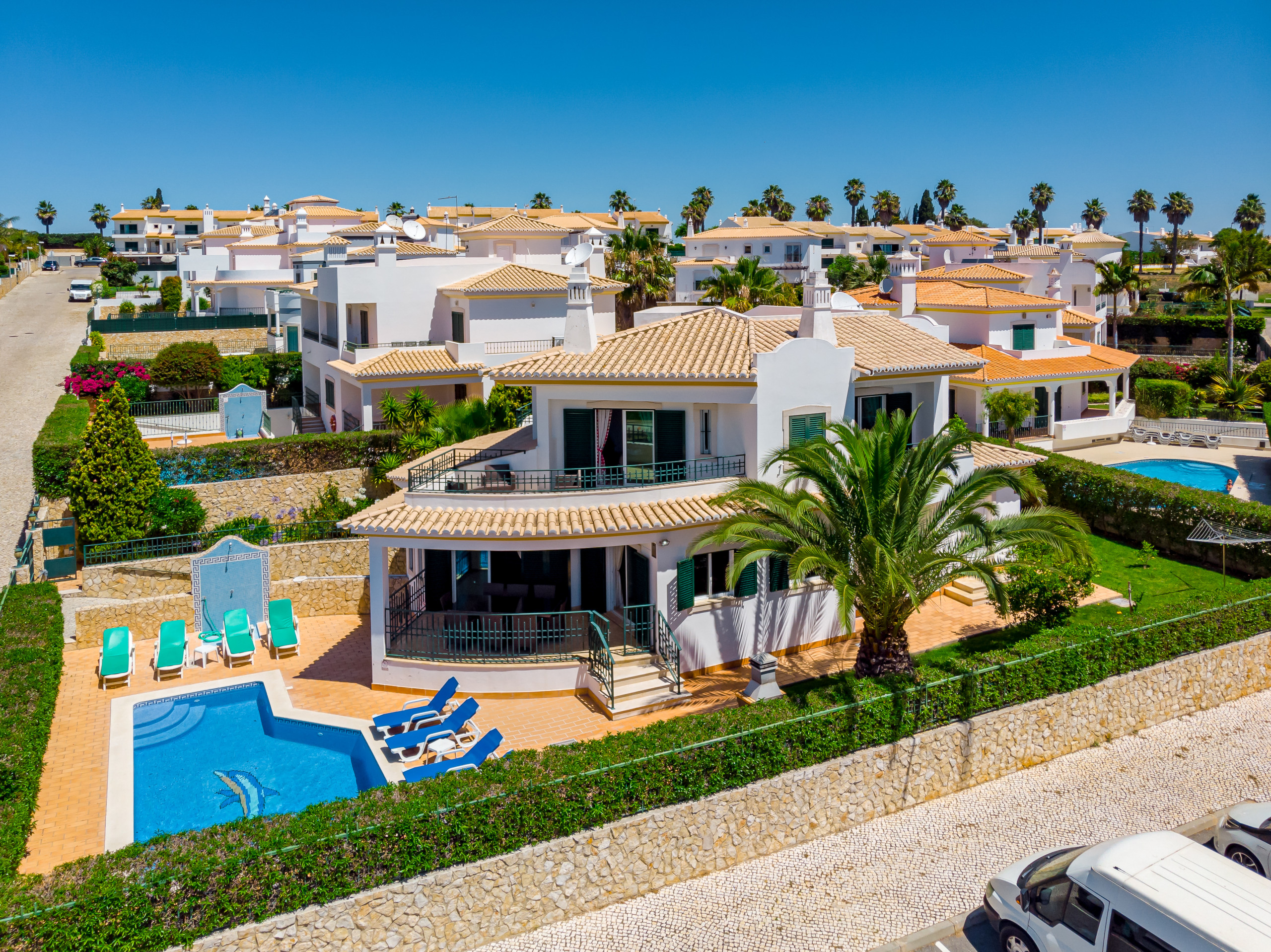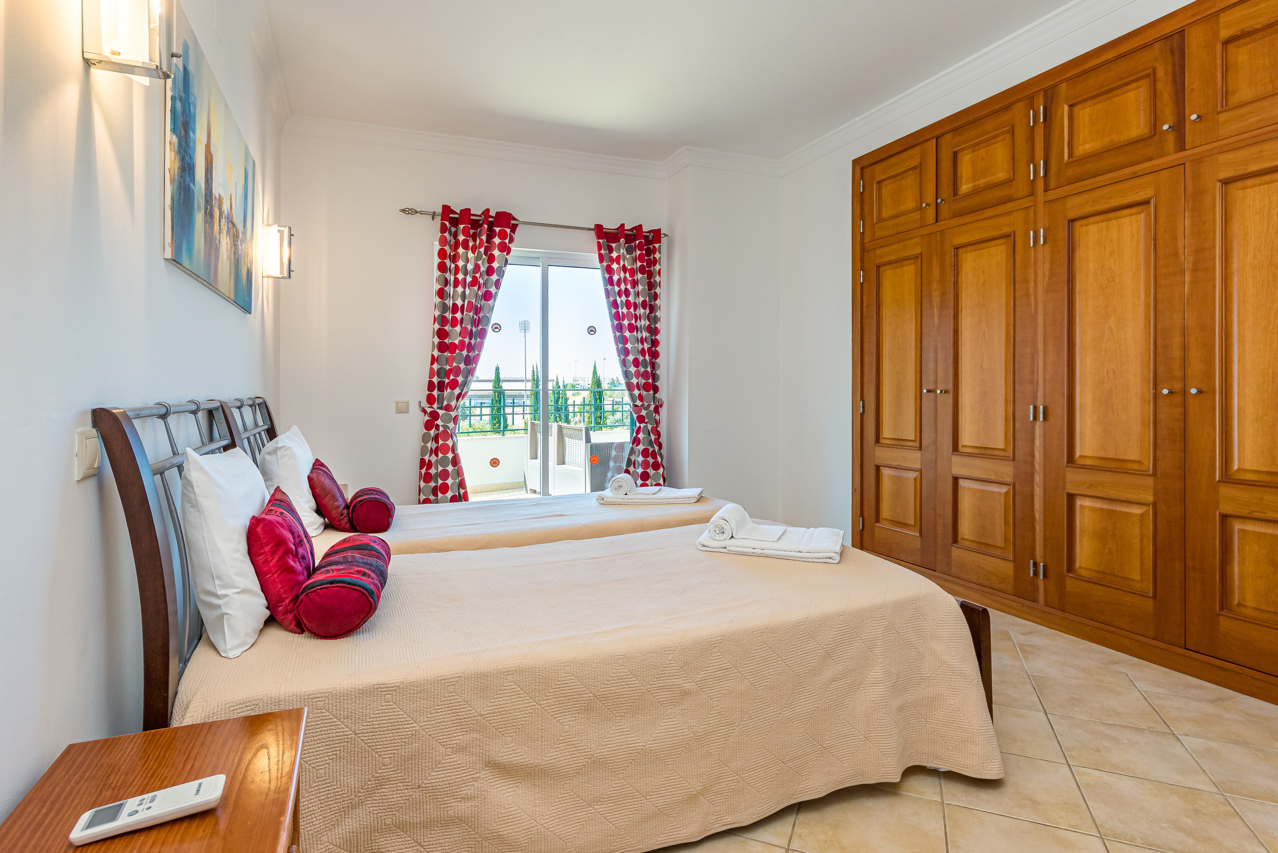 A escadaria curva leva ao primeiro andar onde há 3 quartos espaçosos. O quarto principal tem duas camas individuais, roupeiro e uma casa de banho privativa com um duche amplo. Também tem um grande terraço privativo com vista para a piscina. Os outros dois quartos têm duas camas individuais, roupeiro, casa de banho privativa (banheira com chuveiro) e pequena varanda privativa.