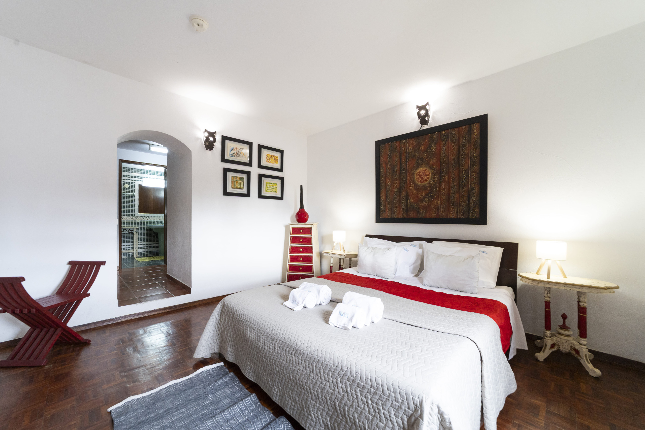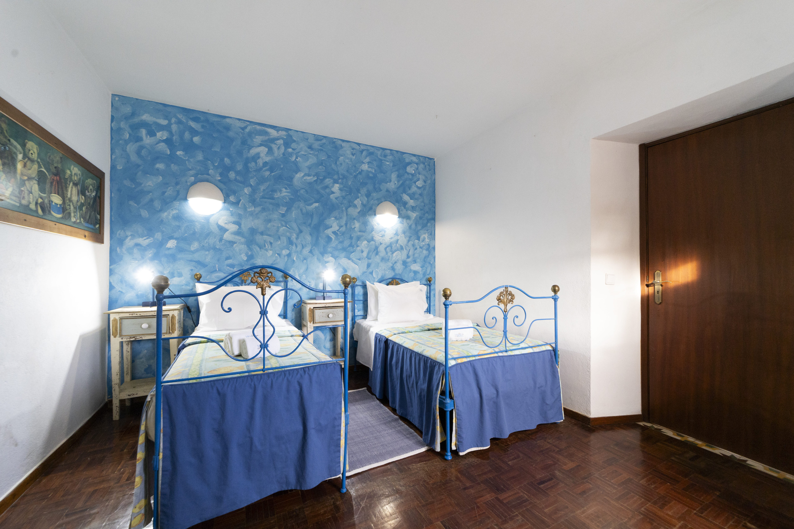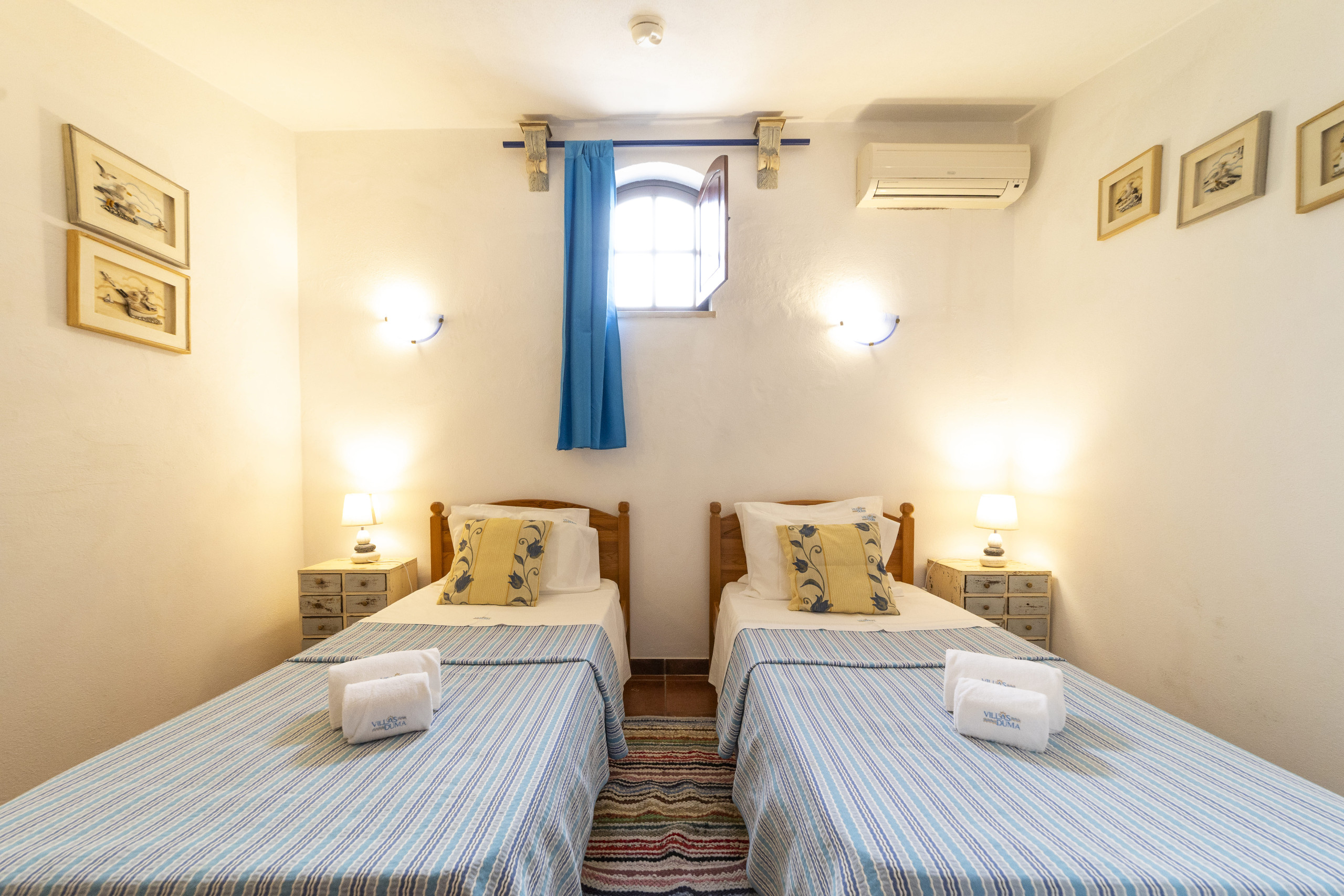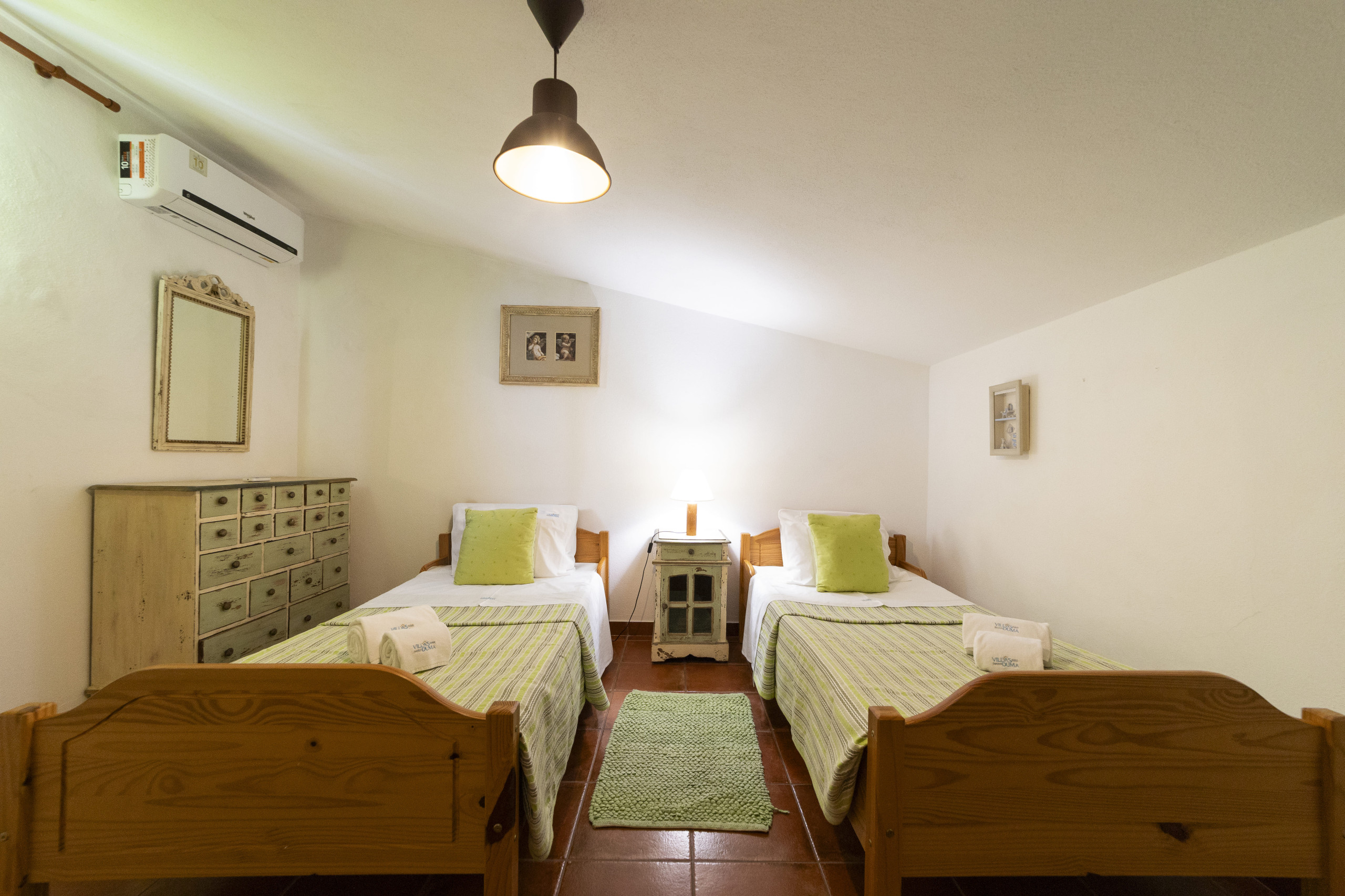 Outro quarto com duas camas individuais também voltado para a piscina e uma casa de banho separada, com cabine de duche e sanita. Ambos os quartos mantêm o charme tradicional e não têm ar condicionado.