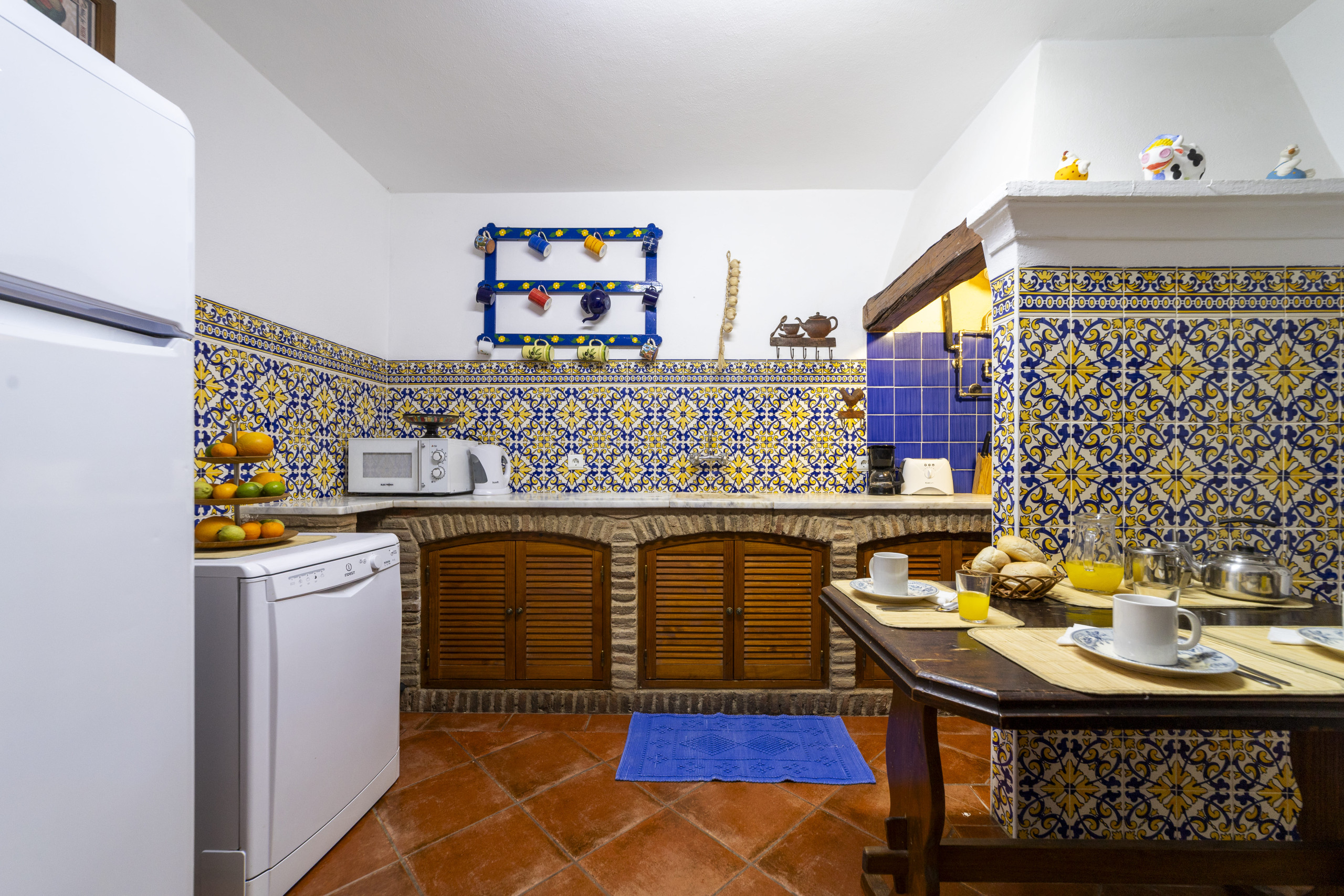 Cinco degraus abaixo da entrada situa-se a cozinha rústica e tipicamente portuguesa. Apesar de não ter janelas, está totalmente equipada com frigorífico, congelador, máquina de lavar loiça, forno elétrico, placa elétrica e micro-ondas.