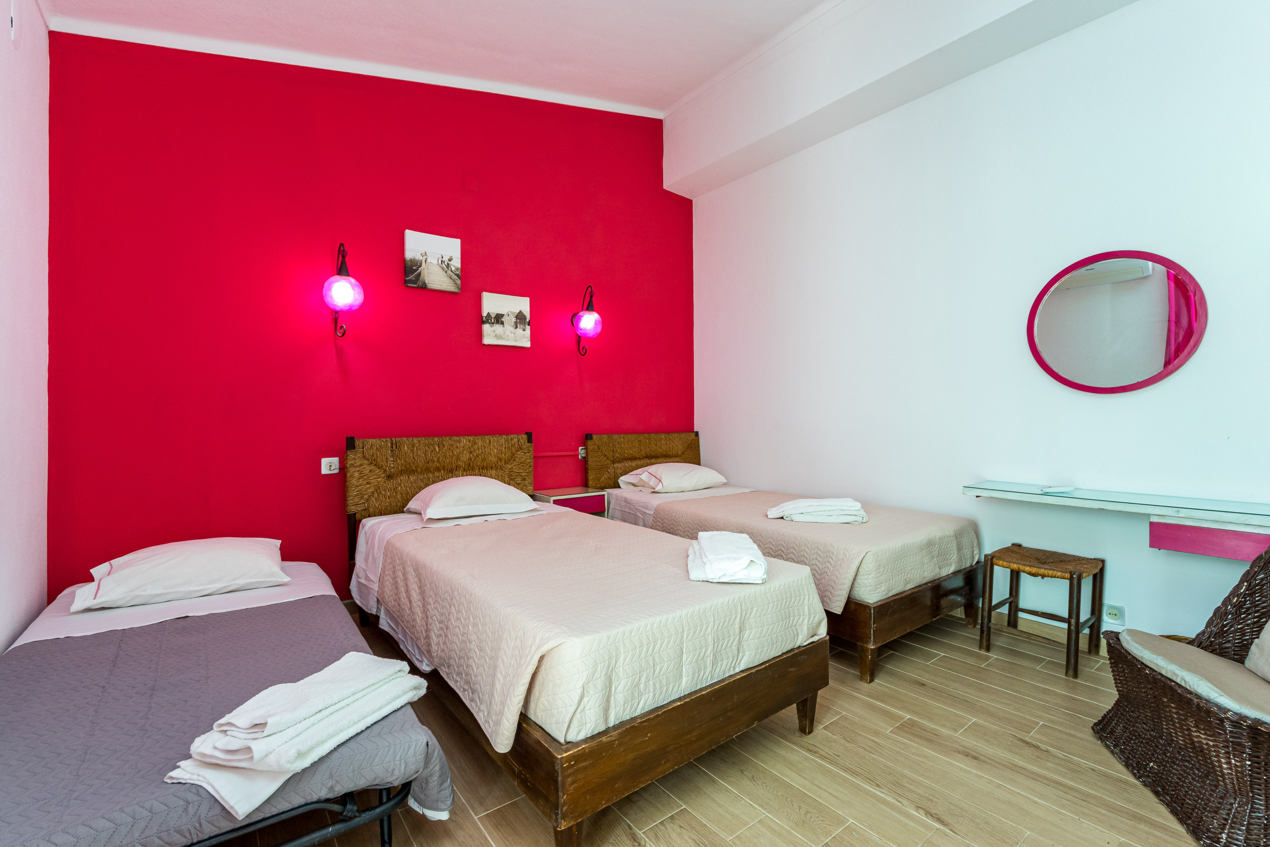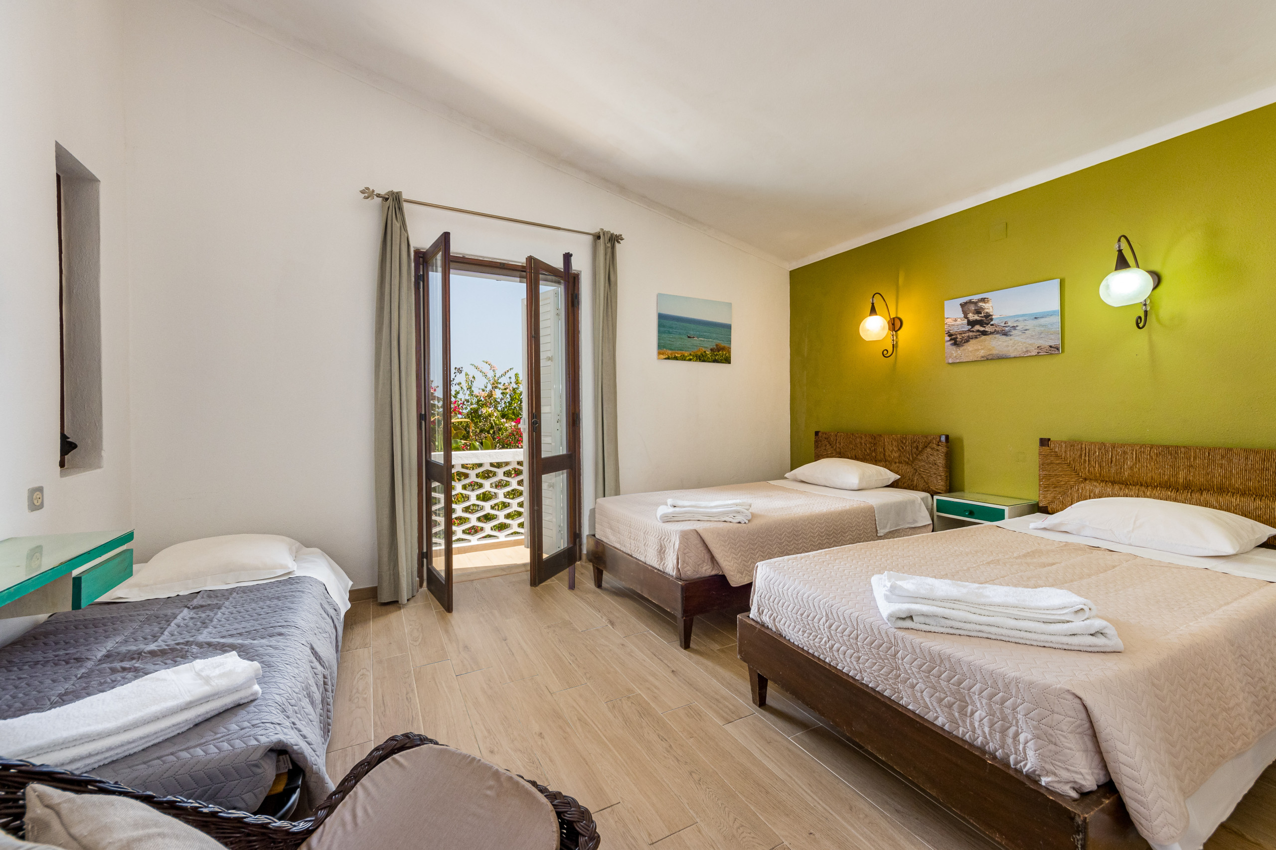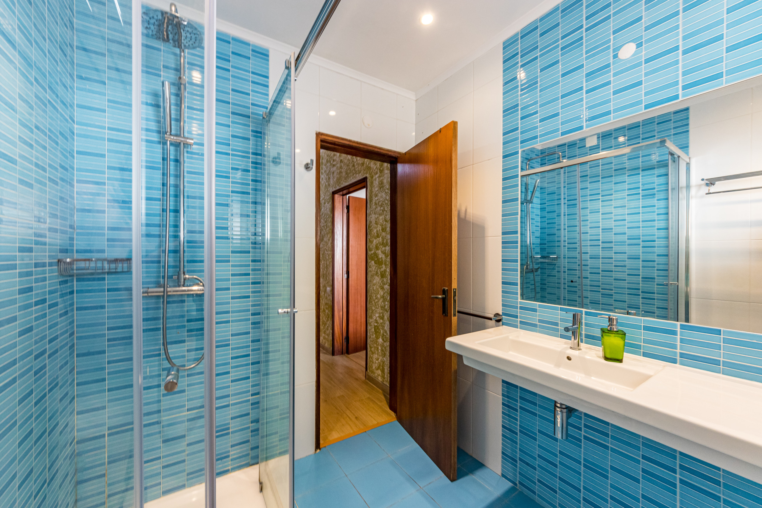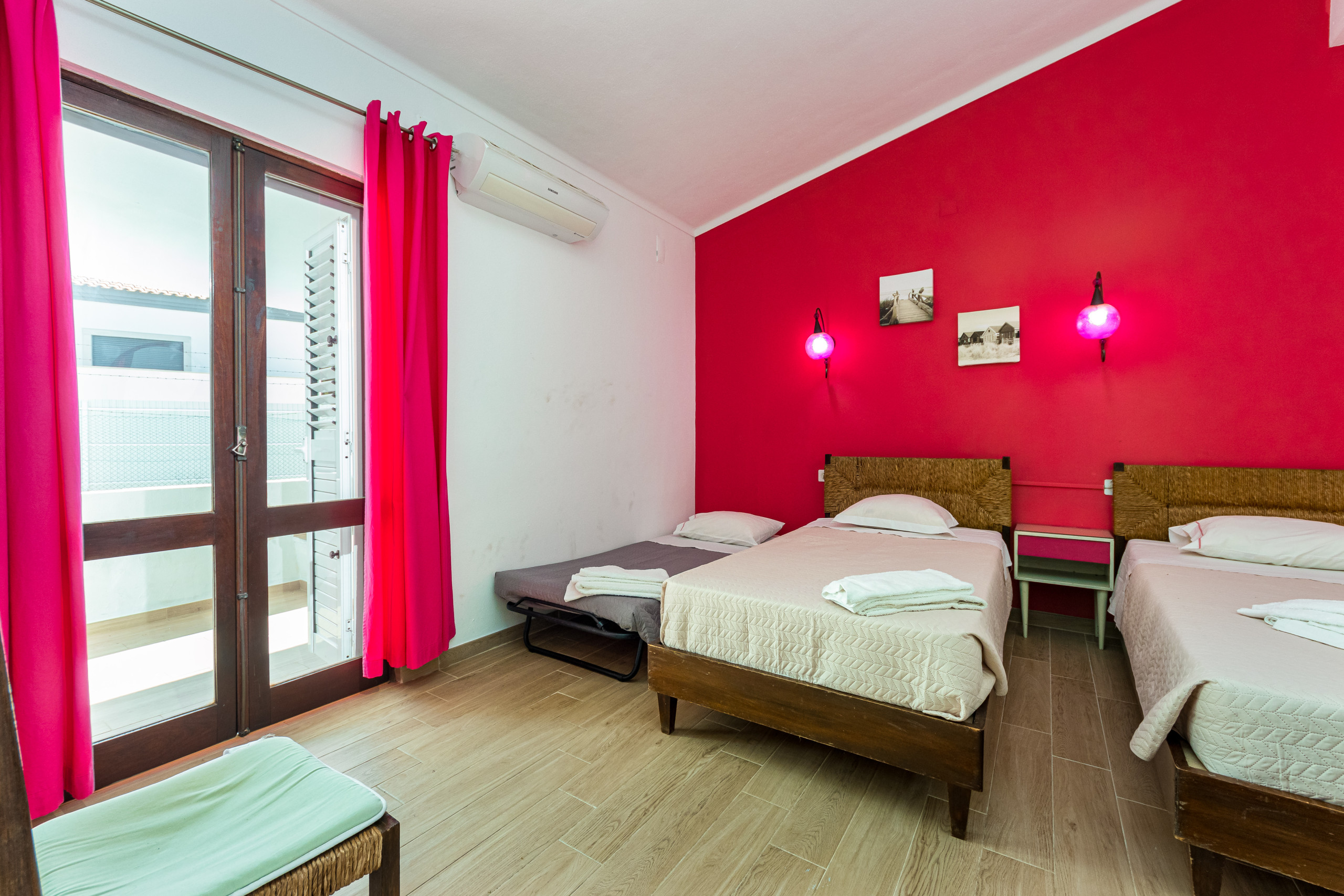 As escadas levam ao piso inferior onde há mais 2 quartos, cada um com duas camas individuais, roupeiros embutidos, ar condicionado e portas de pátio que levam a um terraço compartilhado no piso térreo. Estes 2 quartos partilham uma casa de banho.