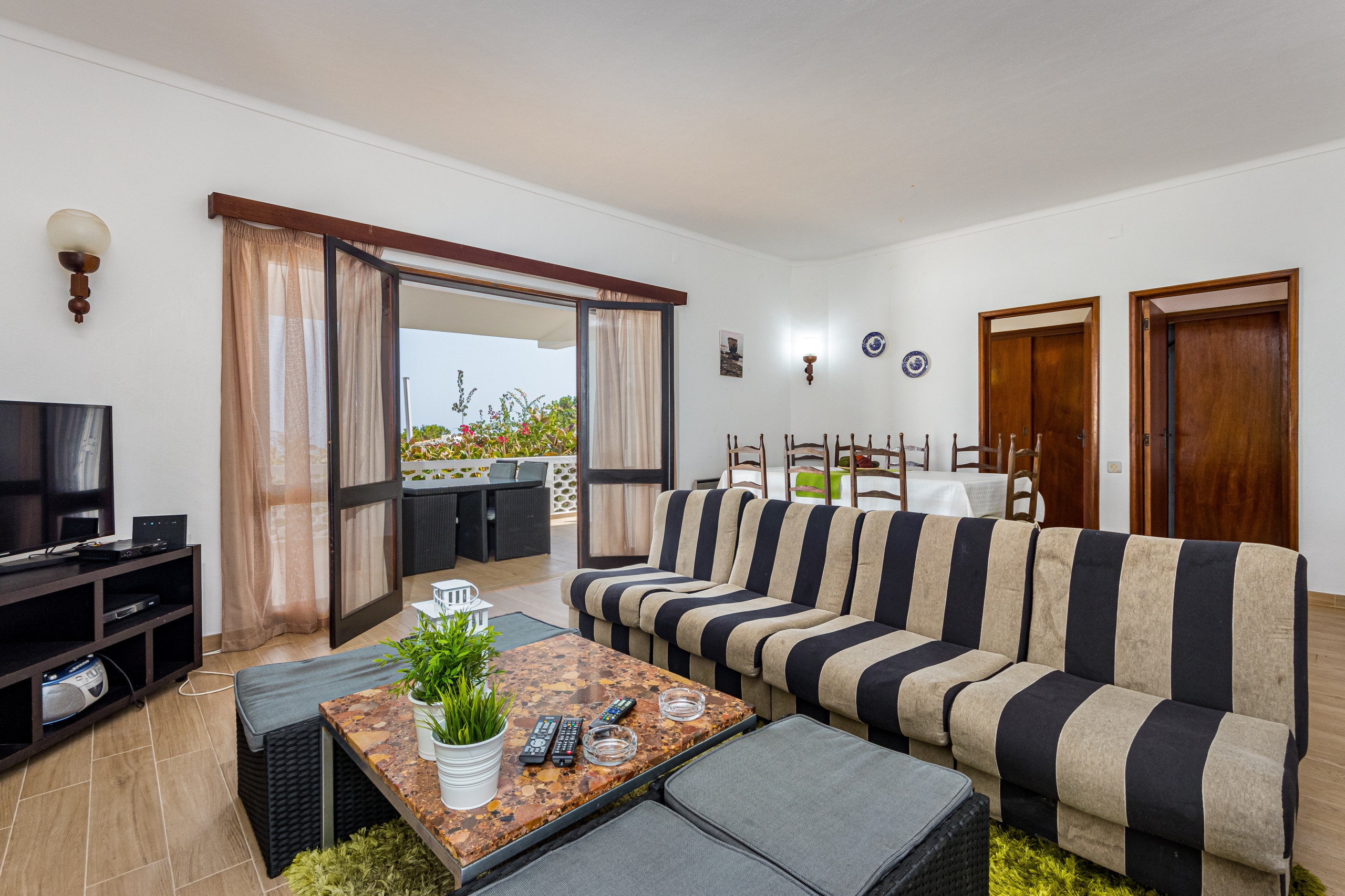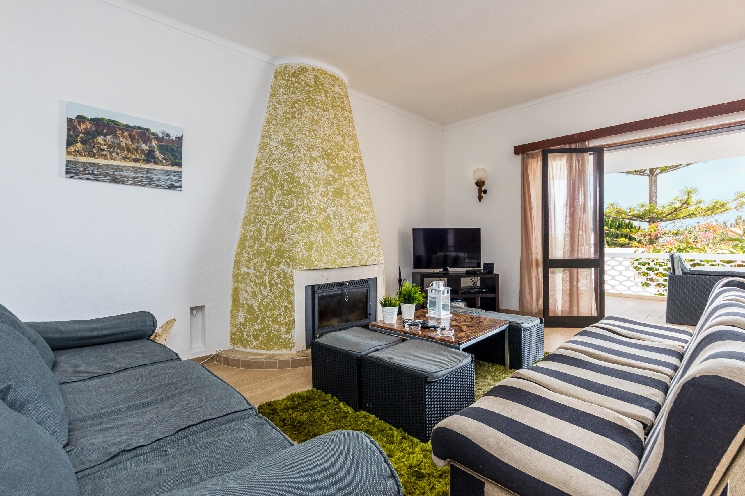A sala de estar tem sofás, lareira a lenha, mesa de jantar e cadeiras, TV de tela plana com alguns canais internacionais através do sistema por cabo e wi-fi. Portas de pátio abrem-se para um terraço coberto com mesa e cadeiras.