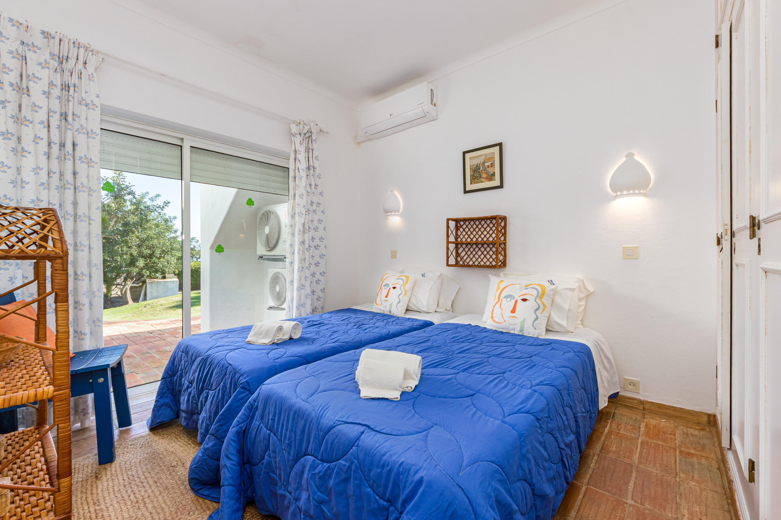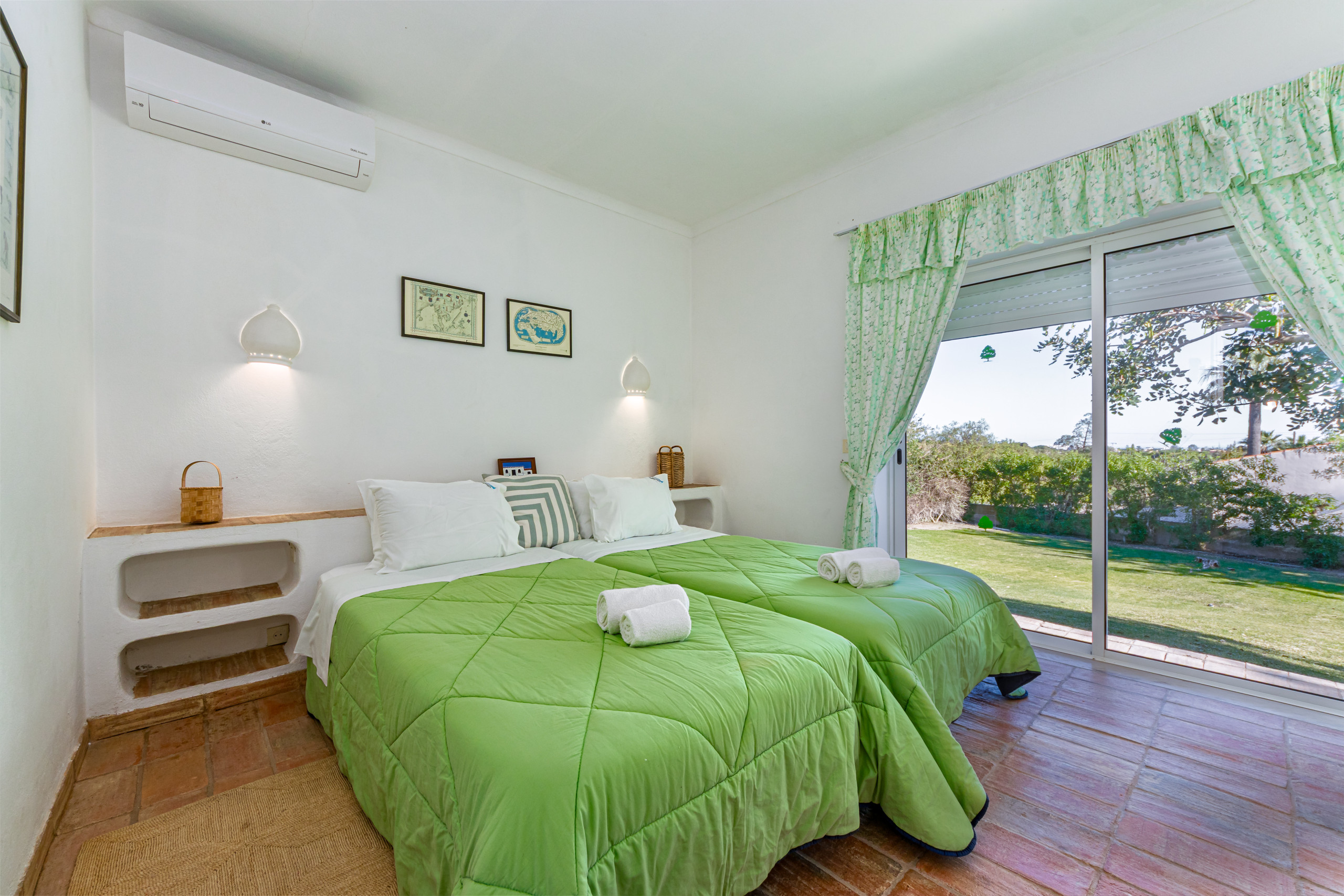 Bedroom 5 has twin single beds, fitted wardrobe, window with shutters and air conditioning.