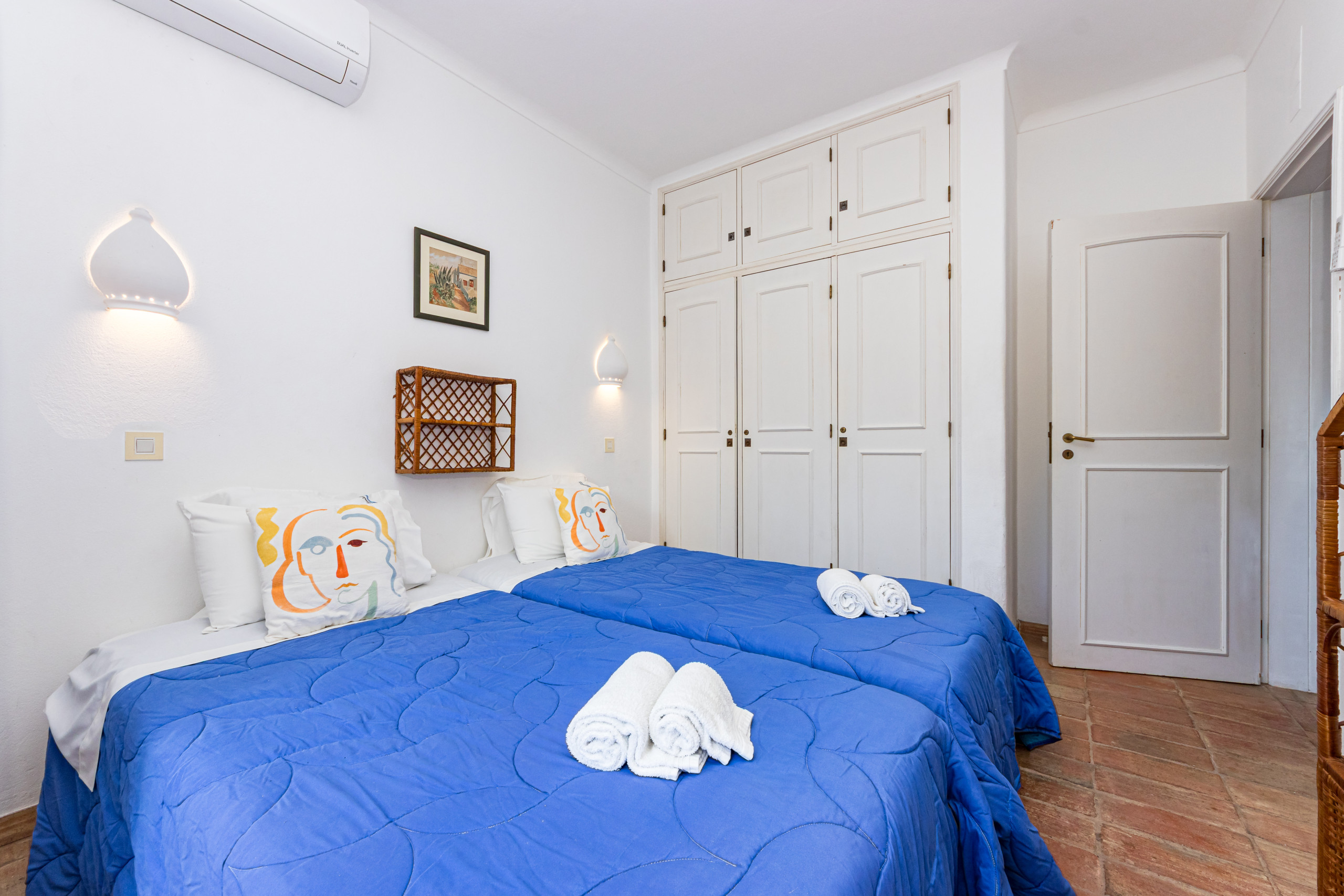 Bedroom 2 has twin single beds, fitted wardrobe, window with shutters and air conditioning.