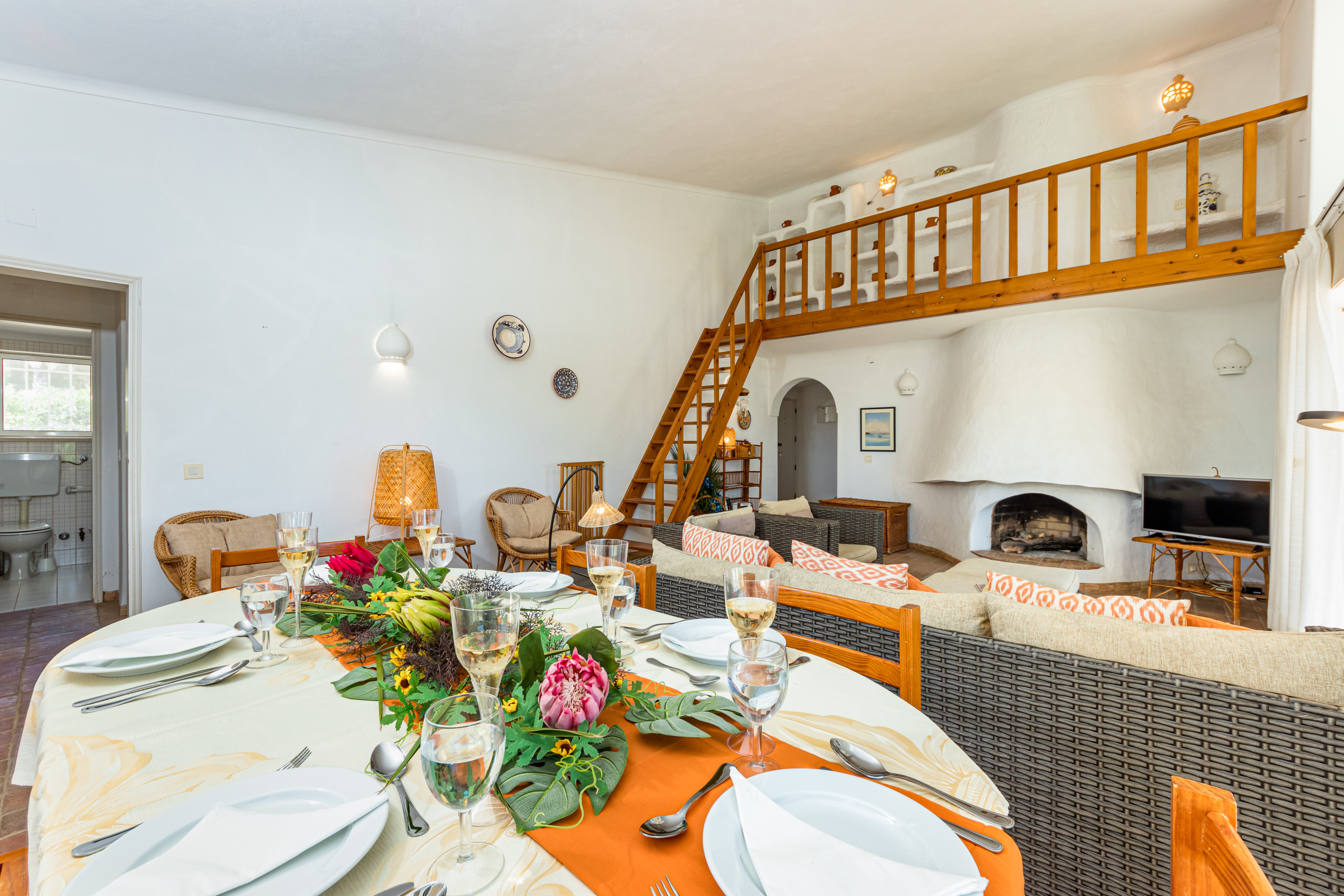 The living room is spacious and has a fireplace, TV and dining table and 8 chairs with a great view of the pool and garden. There is also a traditional mezzanine area with display shelves accessed via open stairs.