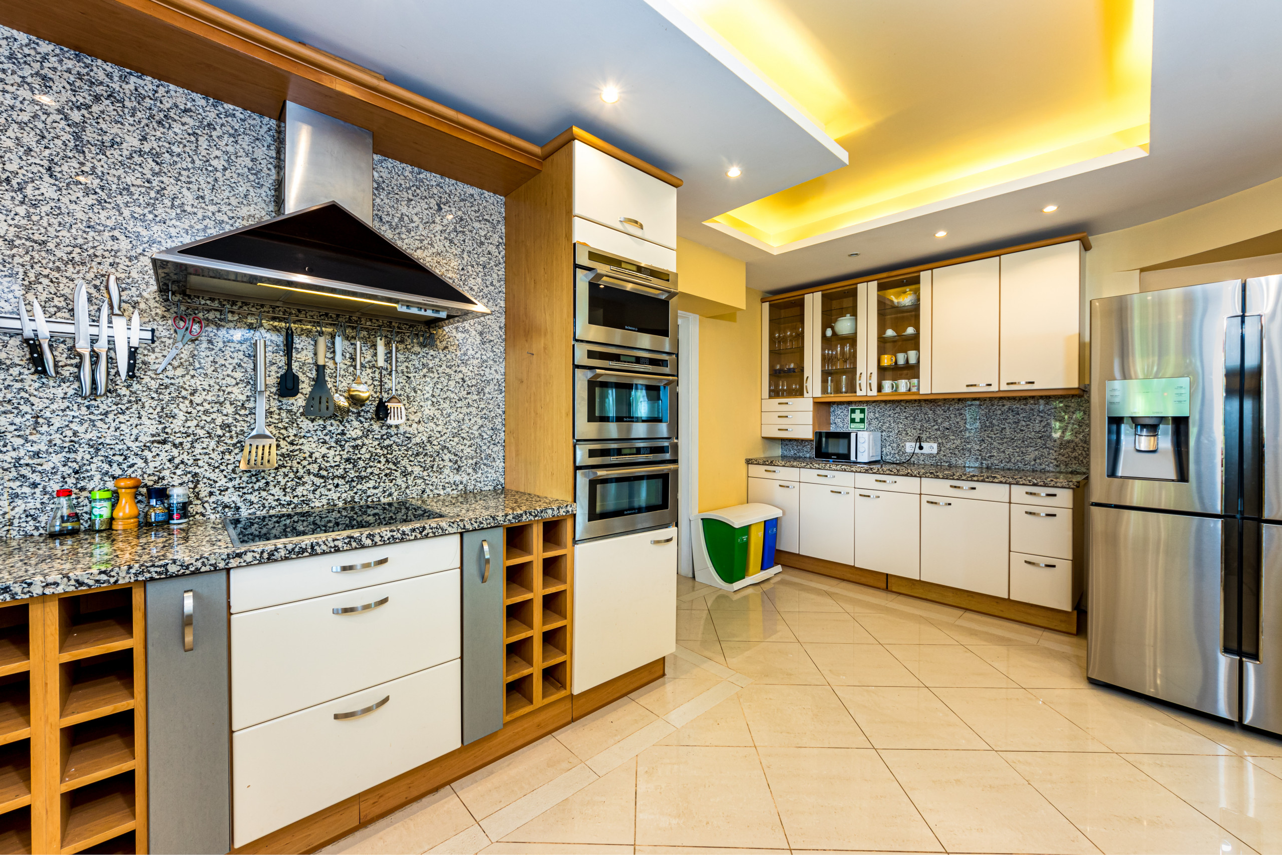 There is also a second kitchen on the lower ground floor (closer to the swimming pool) which is very handy for cold drinks or preparing snacks and meals without having to go upstairs to the main kitchen. This kitchen is fully fitted and equipped with fridge freezer, electric oven, electric hob, extractor fan, microwave and a breakfast bar with stools.