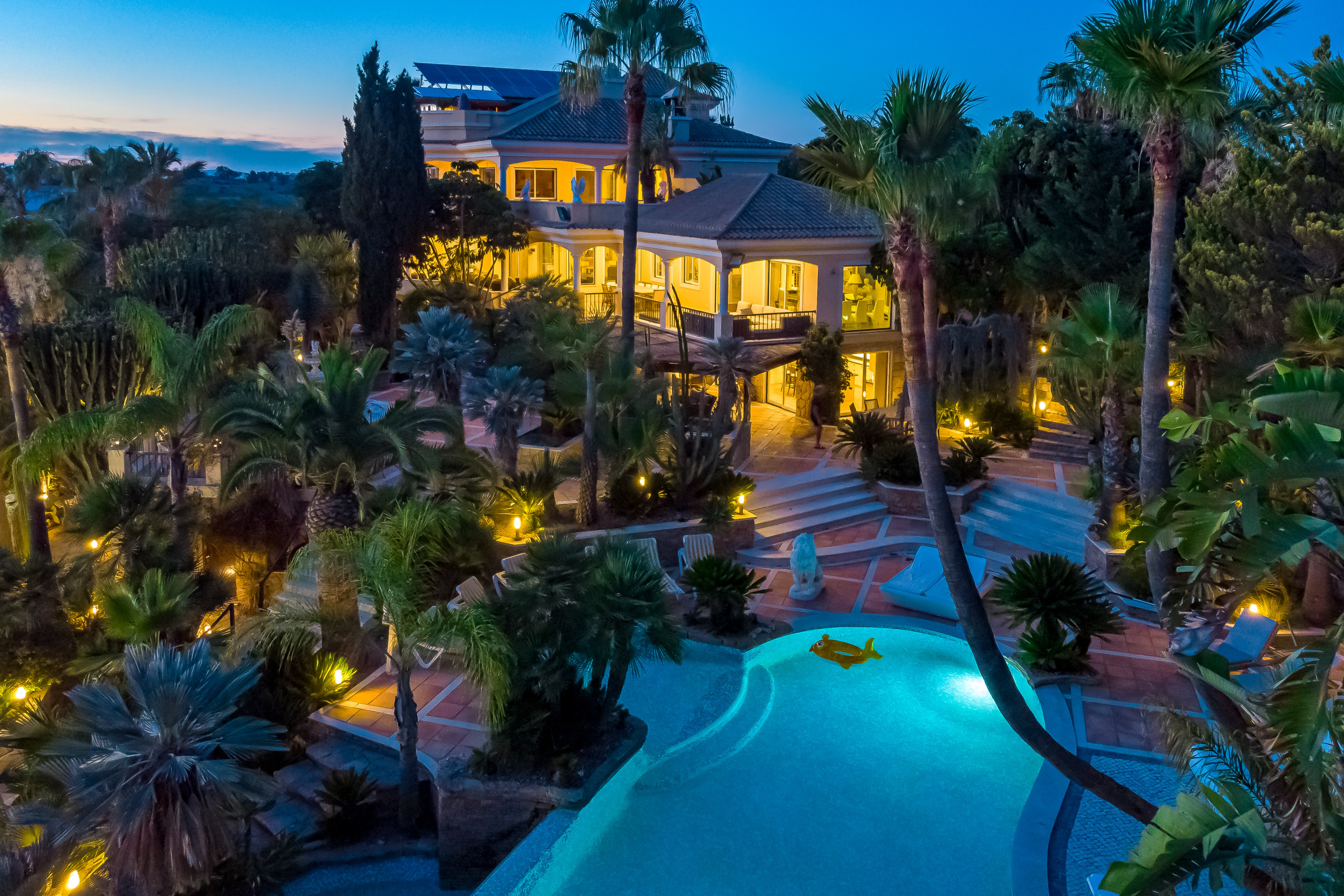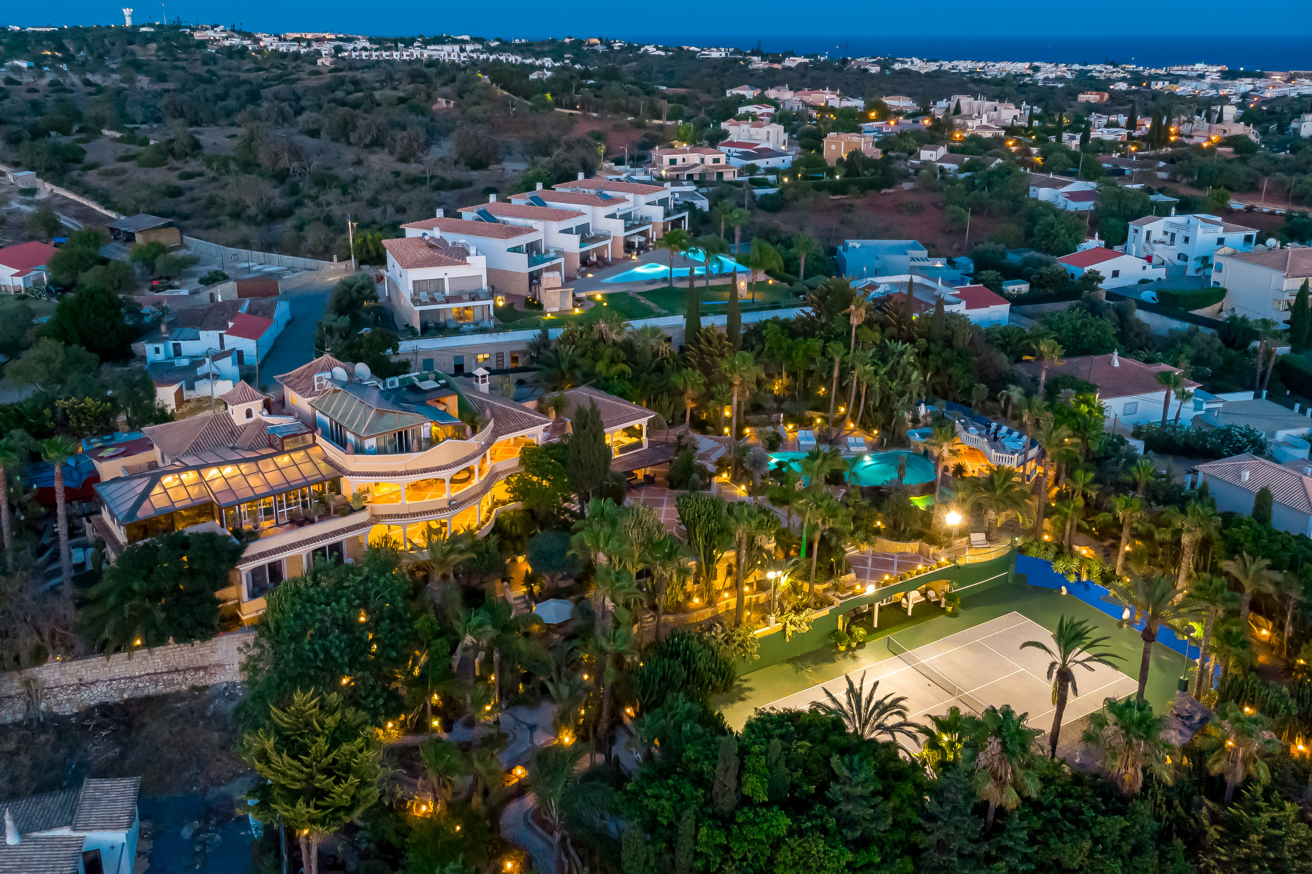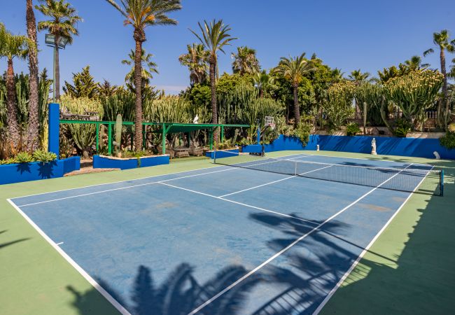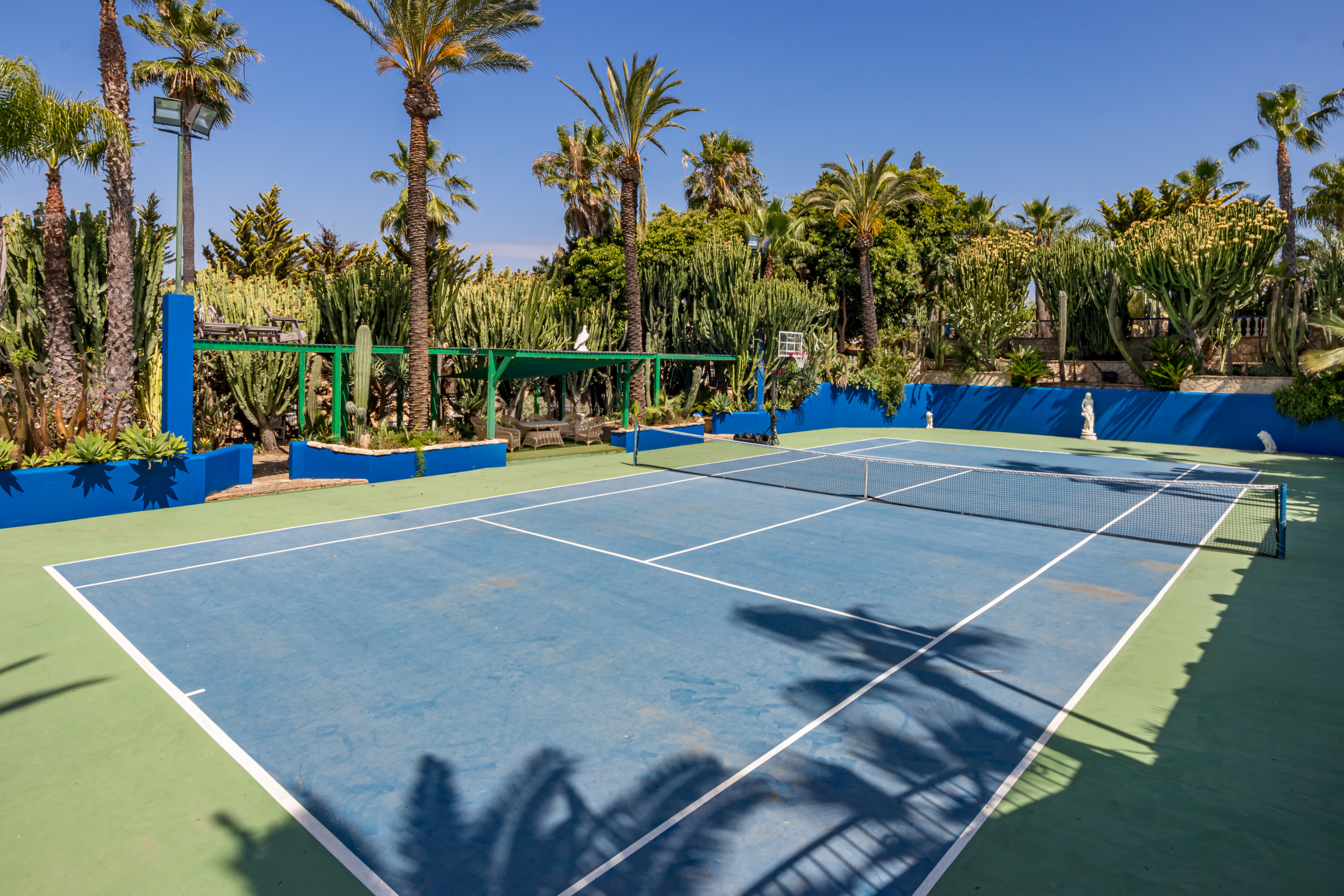 Externally, pathways meander through the cacti and palm tree gardens to the large swimming pool, tennis court and pool table.