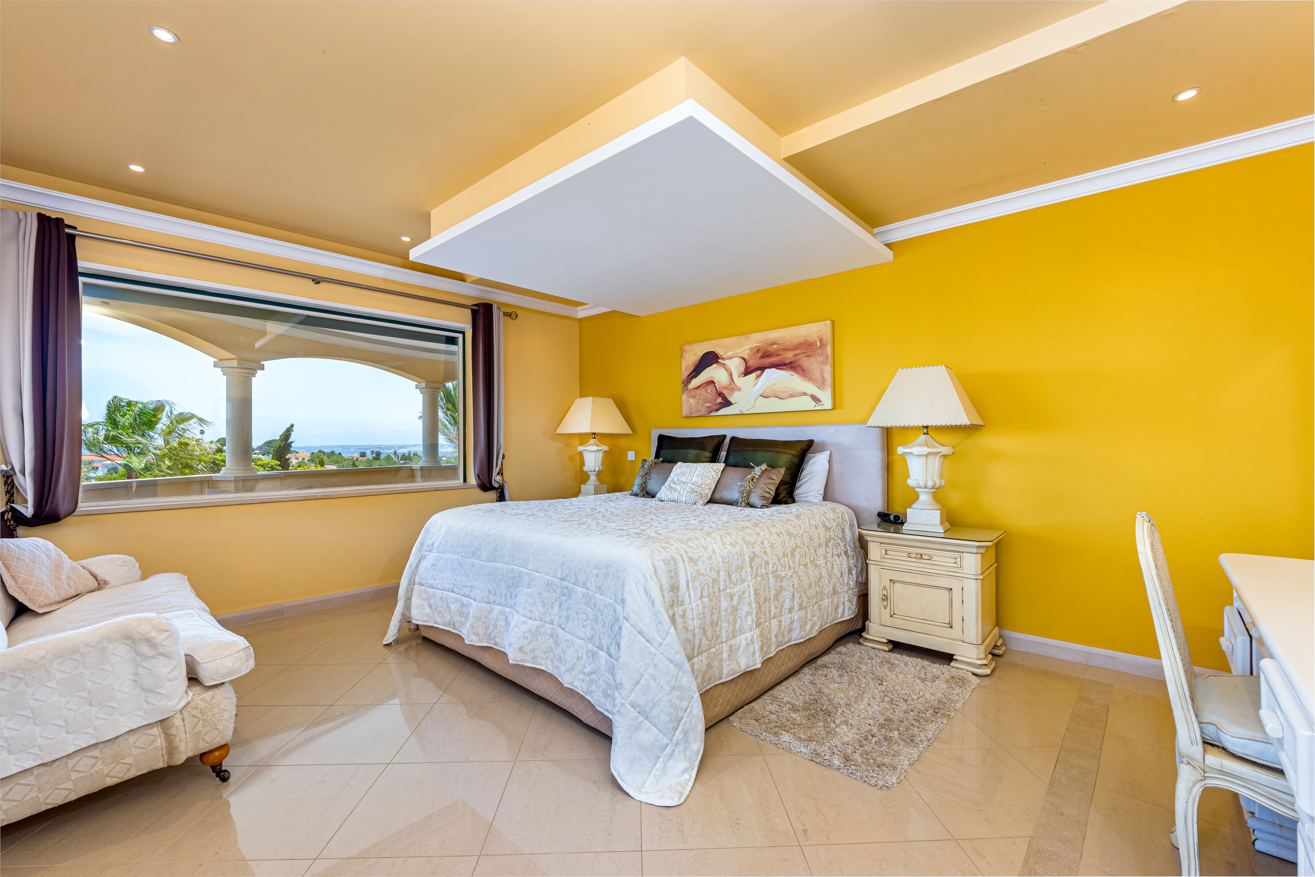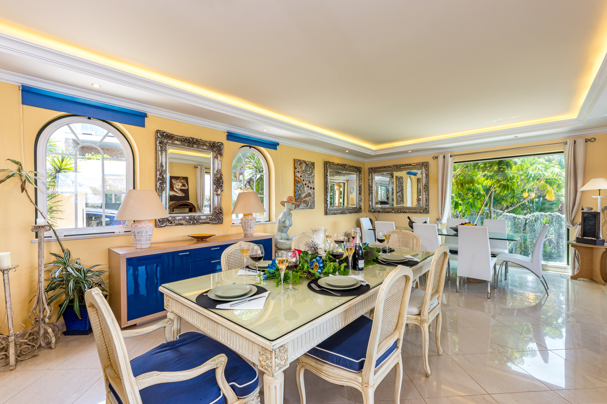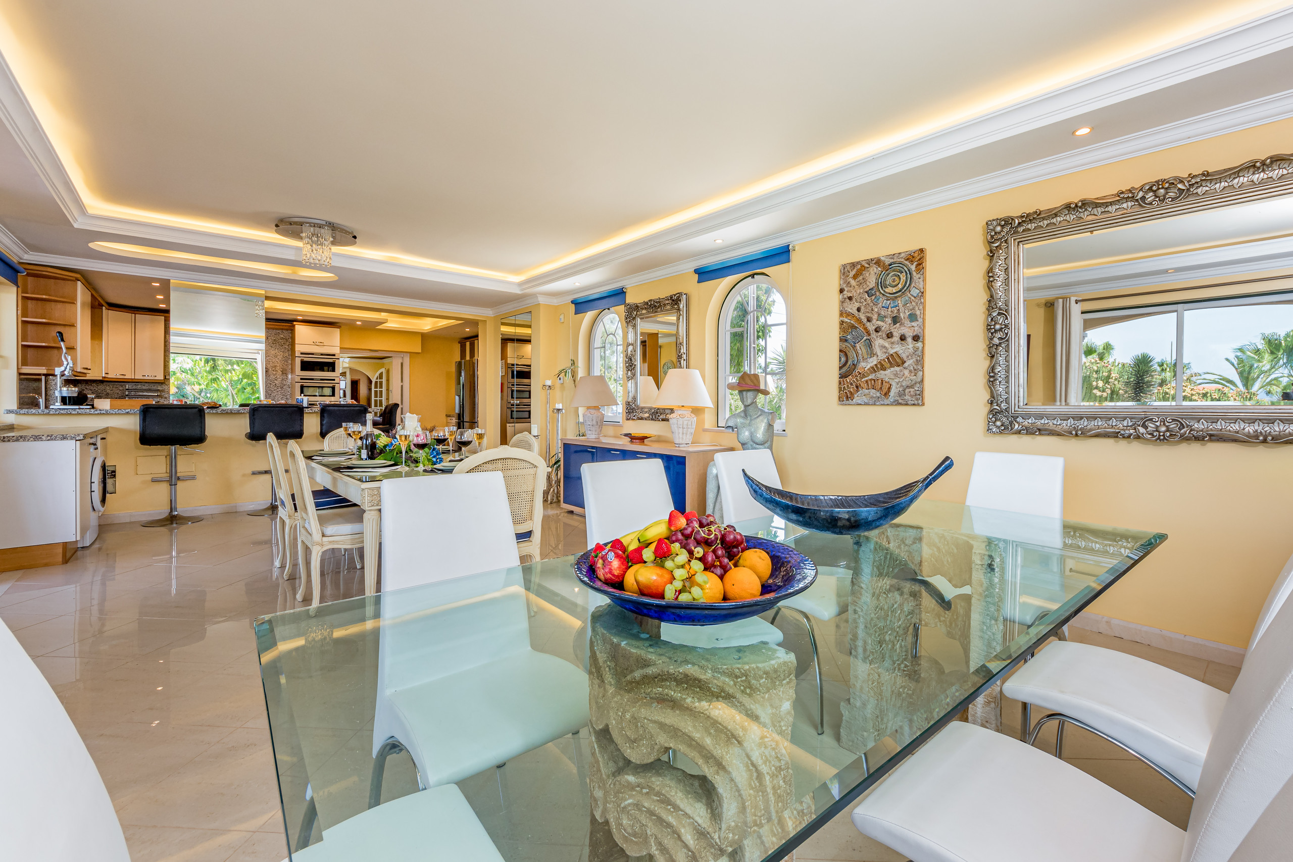 The spacious living area features ample sofas, large flat screen smart TV, a library, a marble dining table with 8 chairs and access to the terraces with stunning views across the cacti gardens and to the sea. There is internet access via wi-fi.
