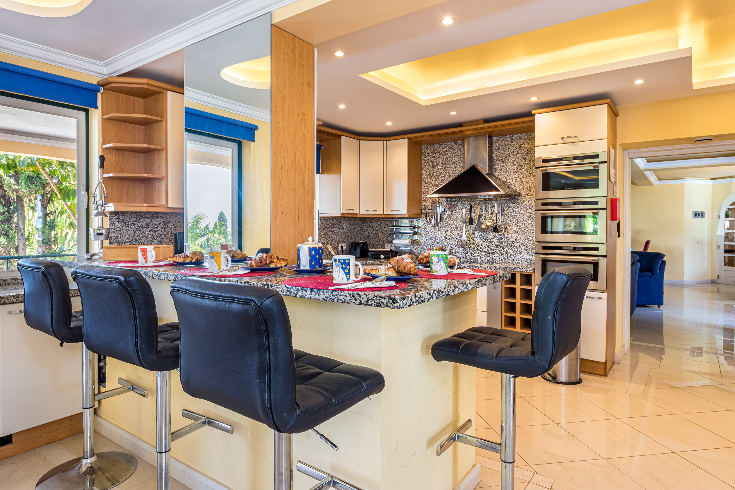 There is also a second kitchen on the lower ground floor (closer to the swimming pool) which is very handy for cold drinks or preparing snacks and meals without having to go upstairs to the main kitchen. This kitchen is fully fitted and equipped with fridge freezer, electric oven, electric hob, extractor fan, microwave and a breakfast bar with stools.