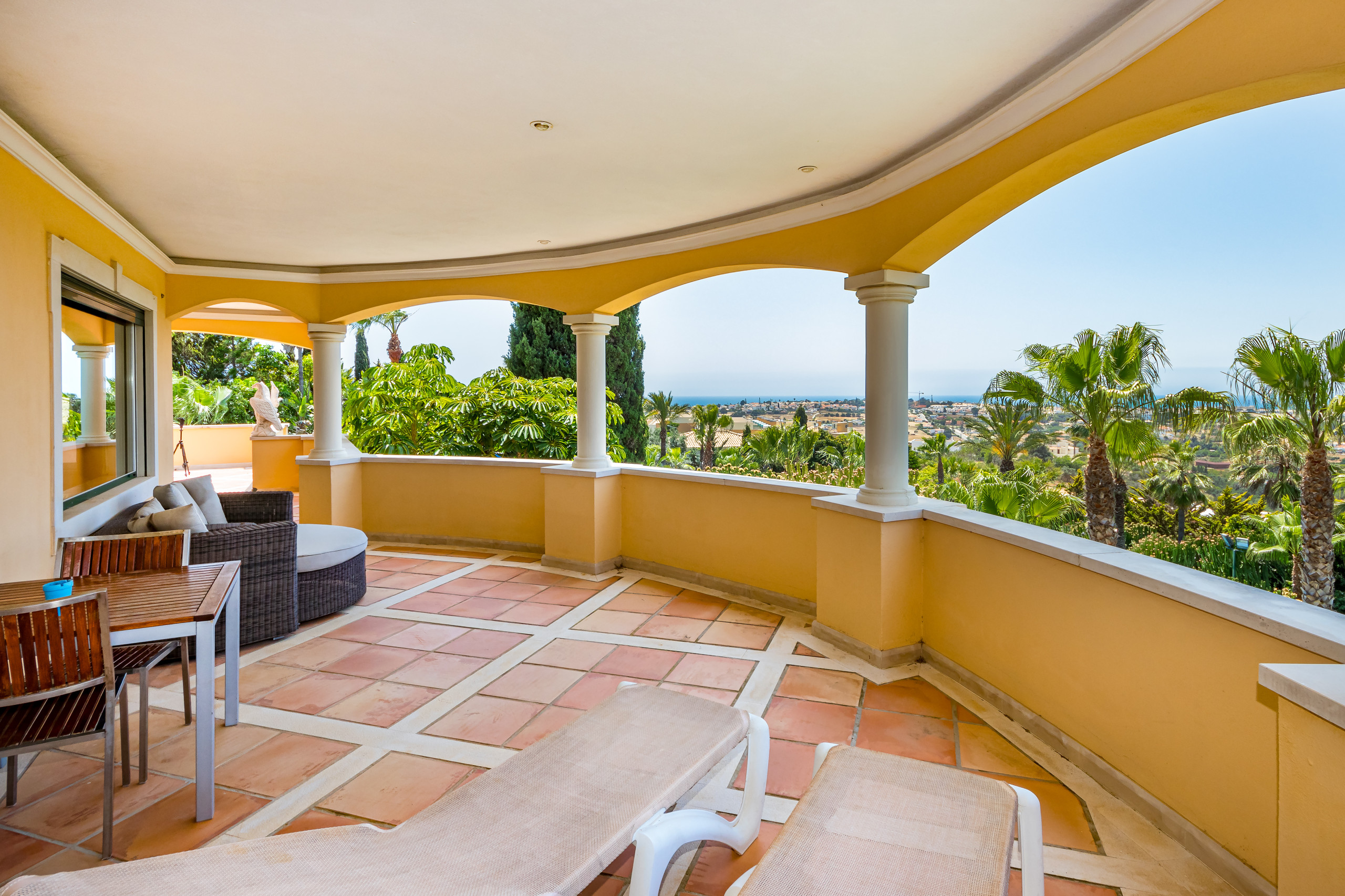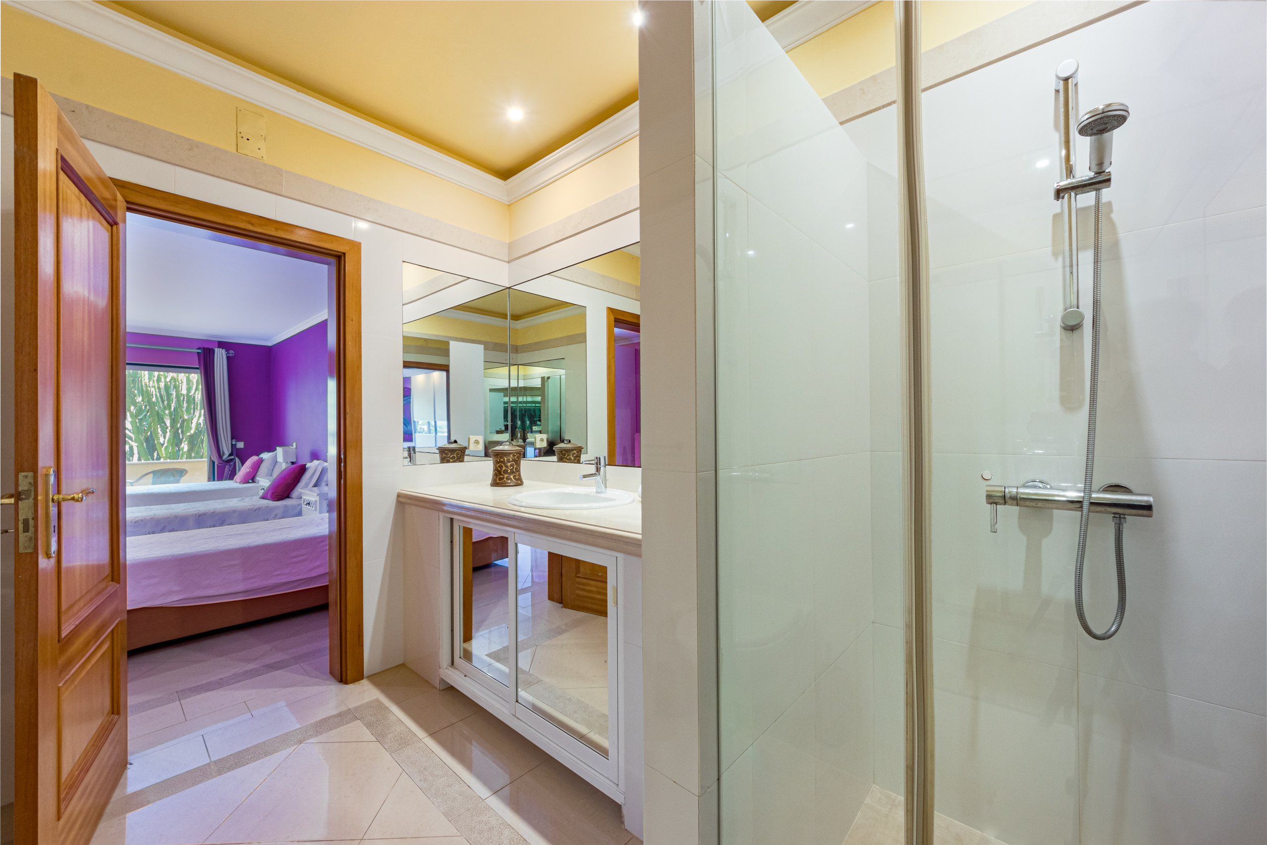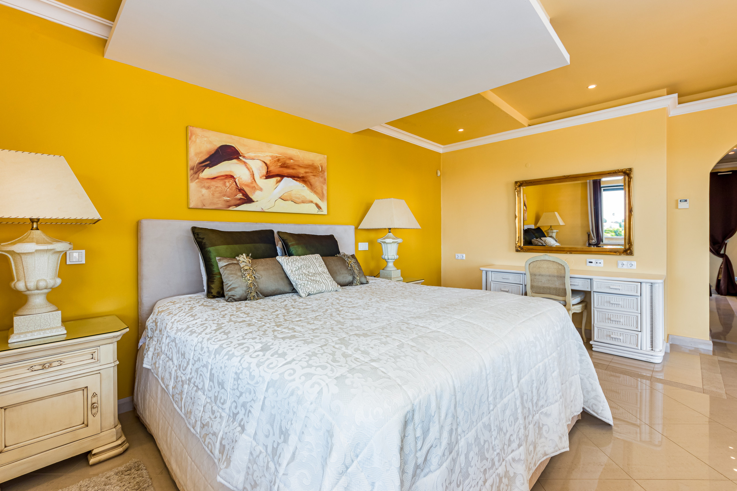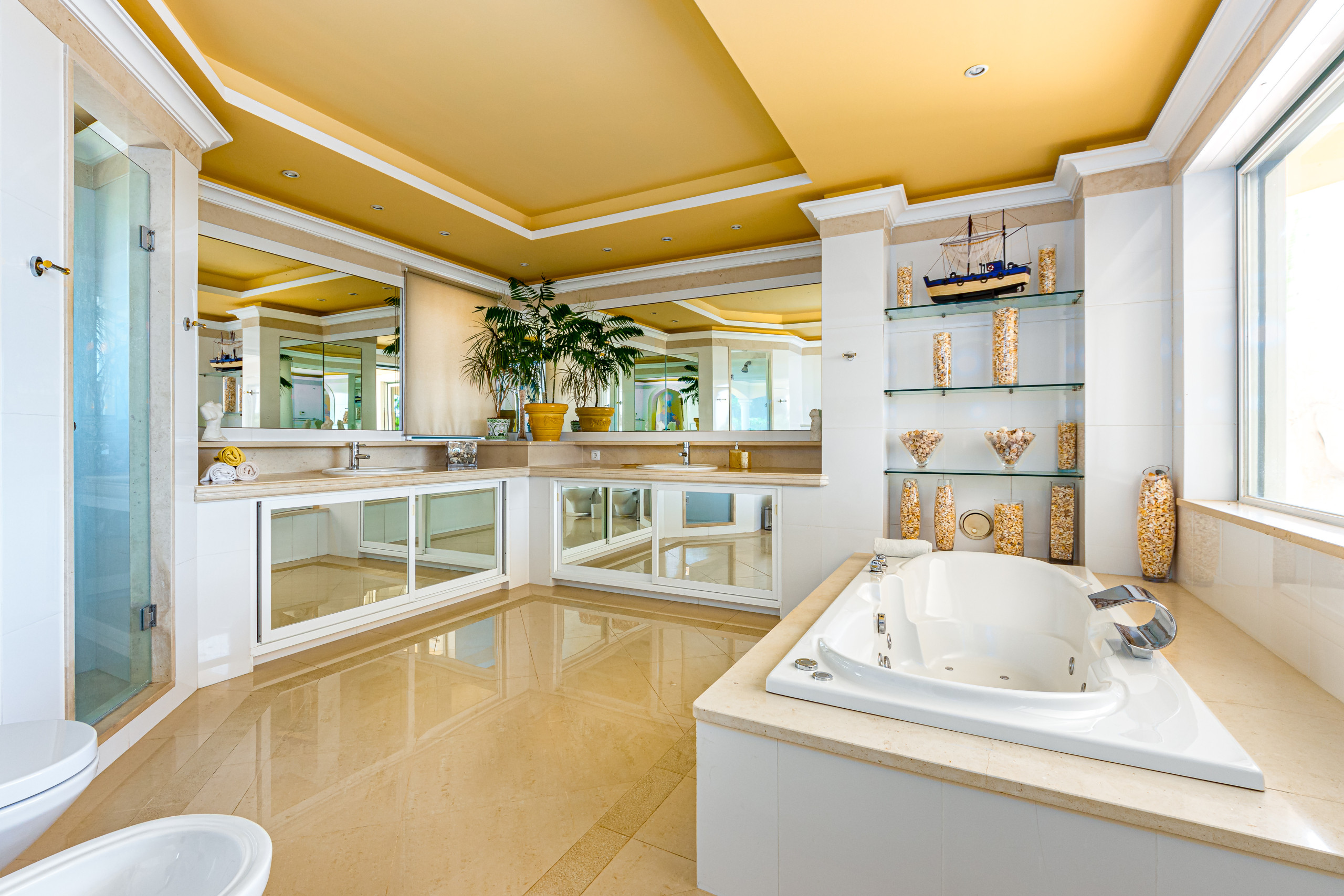 On the first floor Bedroom 4 is the huge master bedroom with a separate dressing area, ample fitted wardrobes, a private bathroom with hydro massage bath tub (with views out over to the sea), shower cubicle and twin sinks. The bedroom has a king size bed and access to a lovely furnished terrace with spectacular views over the gardens and to the sea.