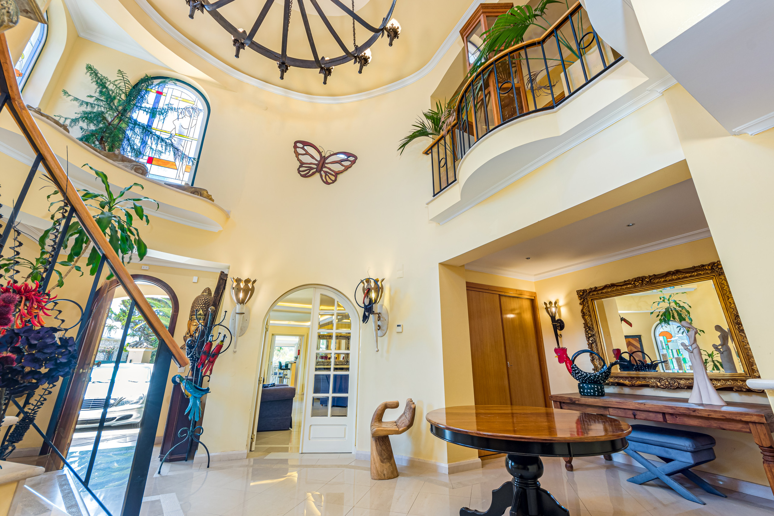 The impressive entrance to the villa features pretty stained-glass windows and a curved staircase to the first floor.