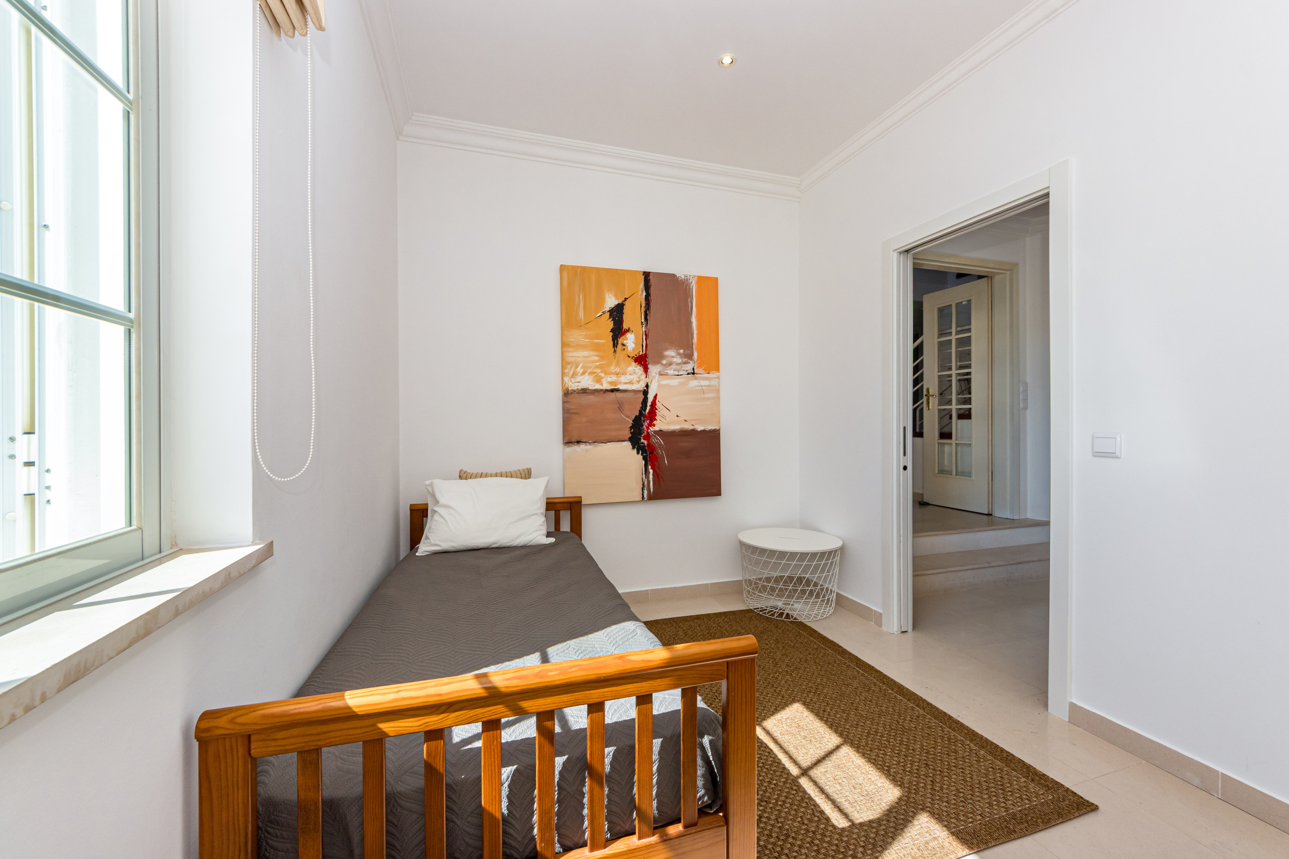 On the first floor there is a full bathroom and a bedroom with twin single beds. The bedroom also features large fitted wardrobes, air conditioning and a private balcony with sea views.